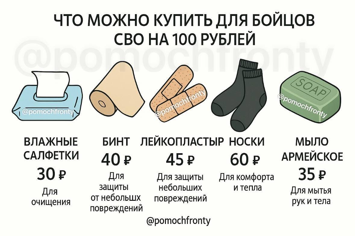 🔥 ПРАВДА О «МЕЛОЧАХ»: Что творят 100 рублей на фронте СВОи, сегодня развеиваем миф о том, что «маленькие суммы не решают». Когда видишь сборы на десятки тысяч, кажется: «Мои 100 рублей — капля в море». А на самом деле эта «капля» творит настоящие чудеса! Вот реальная магия 100 рублей: 💧 Влажные салфетки — когда душ недоступен неделями 🩹 Бинты и пластыри — первая помощь всегда под рукой 🧦 Носки — сухие ноги спасают от болезней 🧼 Армейское мыло — гигиена в окопе не роскошь 🔋 Батарейки — связь работает, когда жизнь зависит от неё 🔧 Изолента — чинит всё, от экипировки до техники 🧻 Туалетная бумага — базовый комфорт человека 🔥 Зажигалка — тепло и свет в критический момент ☕ Чай/кофе — глоток тепла в холодном окопе Секрет в том, что этих «мелочей» нужно МНОГО и ПОСТОЯННО. Один боец — десятки носков в месяц. Одно подразделение — сотни батареек. А когда 100 человек скинется по стольнику — уже 10 000 рублей! Сегодня уже собрали 48% на ноутбук для Ваги — и большая часть именно от «