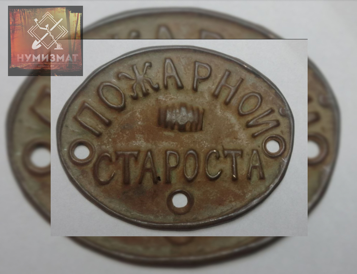 Должностной знак сельского пожарного старосты. Овальная форма. Завальцовка краёв. Три точки для крепления. Не всегда такие знаки крепились на одежду, известны случаи, когда их крепили на столбы ворот домов пожарного старосты. Написание в старом стиле пожарнОй староста. В центре изображена бочка, как самый типичный пожарный инвентарь.