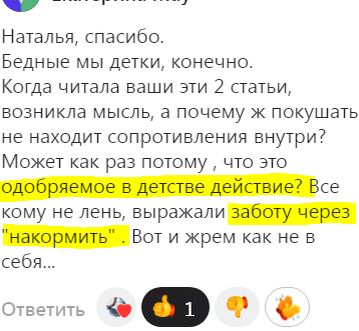 И очень часто обнаруживаем с доверителями управляющие убеждения, что еда - это праздник, яркие положительные эмоции, когда взрослые довольные и расслабленные, любят тебя, хотят тебя чем-то побаловать, прощают "шалости", разрешают "баловаться", т.е. разрешают просто перестать бояться наказания за какой-то случайный "плохой" поступок.