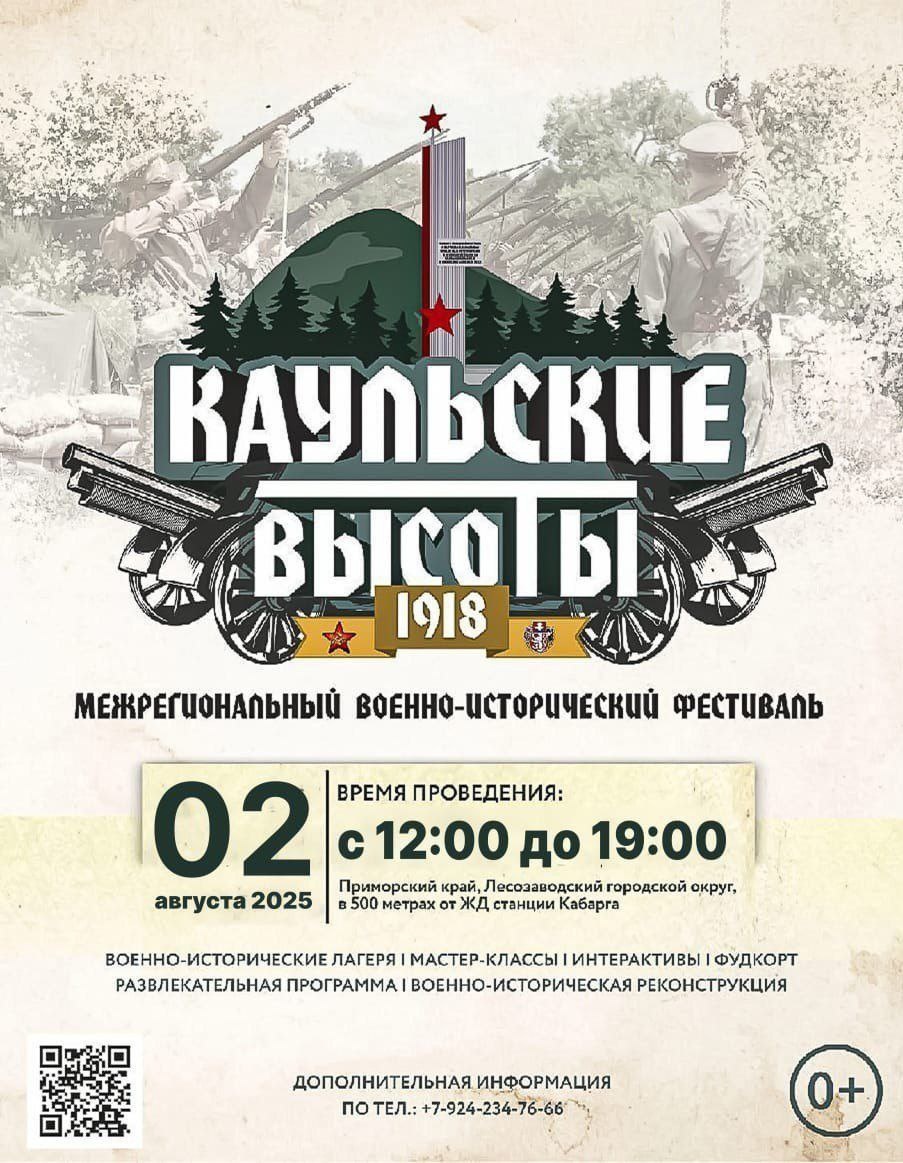 КАУЛЬСКИЕ ВЫСОТЫ 2 августа 2025 года в нашем округе (в 500 метрах от станции Кабарга) пройдет масштабный фестиваль «Каульские Высоты». В программу фестиваля входит: 1️⃣Военно-историческая реконструкция боев лета 1918 года; 2️⃣Историческая справка о событиях гражданской войны на Дальнем Востоке; 3️⃣Интерактивные площадки и мастер-классы для гостей всех возрастов; 4️⃣Фуд-зона; 5️⃣Кемпинг и вечерняя программа. ⏰ Время проведения: с 12:00 до 19:00. Вход свободный! Присоединяйтесь!