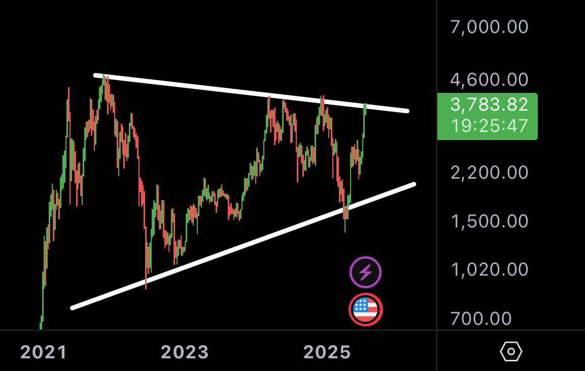 ETH против четырёхлетней стены Ethereum снова у верхней границы фигуры, которая держит рынок уже четвёртый год. Классический сужающийся треугольник: локальные минимумы всё выше, но вершины всё так же упираются в сопротивление — $3800. Если пробьёт — последствия будут масштабнее, чем просто памп по ETH. Потому что: 1. ETH/BTC на исторических лоях — малейший переток доминации способен разбудить весь рынок альтов (мы это уже частично видели). 2. Большинство держателей в минусе — это создаёт парадоксальный эффект: когда цена выходит в плюс, они не фиксируют прибыль, они отыгрывают убытки. Это даёт топливо. 3. Фундаментально Ethereum давно перегружен ожиданиями — Layer2, стейкинг, ETF, всё это может реализоваться не вдруг, но сразу. Но если не пробьёт — нас ждёт ещё один откат в рамках той же фигуры. Это значит: альт-сезон снова отложат, ETH продолжит буксовать в зоне неопределённости, а BTC будет тянуть капитал. Что делать? Следим за недельным закрытием выше $3800. Не угадываем — п