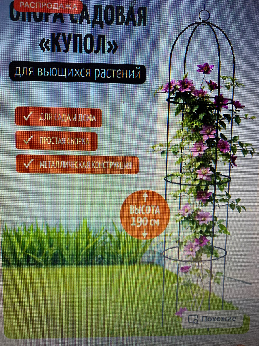 На Wildberries нашла картинку и прочитала отзывы. Выбрала куполообразную опору, так как плоские шириной 50 см оказались совсем неустойчивыми. Опора высотой 190 см, думаю, подойдет для клематисов.