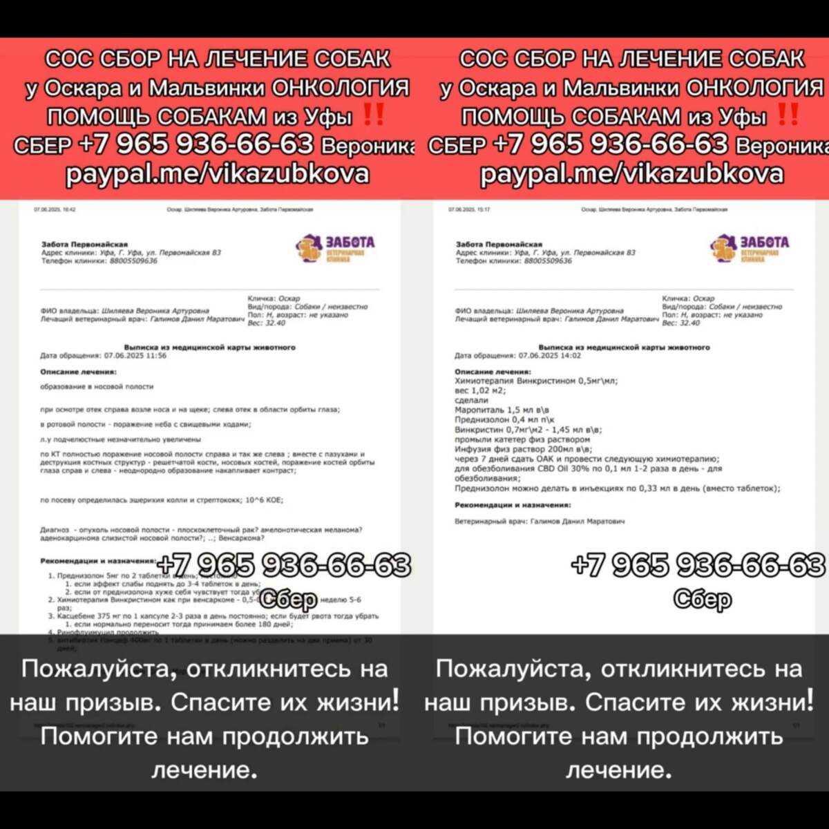 У них рак..Жить им или не жить-зависит от вас, люди. Мы снова обращаемся к вам с просьбой о помощи для несчастных заболевших Собак ИЗ ОТЛОВА БАШКИРИИ — Мальвинки и Оскара. Эти две замечательные собаки продолжают бороться с венсаркомой и проходят курс химиотерапии. Сейчас они проходят курс химии, и, к счастью, мы видим первые улучшения!. Но эта борьба требует не только сил, но и средств. ✔️ На данный момент мы собираем средства на лечение на месяц Август. Общая сумма, необходимая для поддержки наших питомцев, составляет 37.200 рублей. Это включает в себя: • 3 650 рублей на химиотерапию для Оскара • 3 650 рублей на химиотерапию для Мальвины + 2000 зоотакси Таким образом, каждую неделю нам необходимо 9.300 рублей на обоих собак. И это только расходы на химиотерапию! К сожалению, к этой сумме добавляются и другие препараты, которые тоже нужны для их лечения.... Мы понимаем, что времена непростые, но каждая ваша помощь имеет огромное значение для наших четвероногих друзей. По
