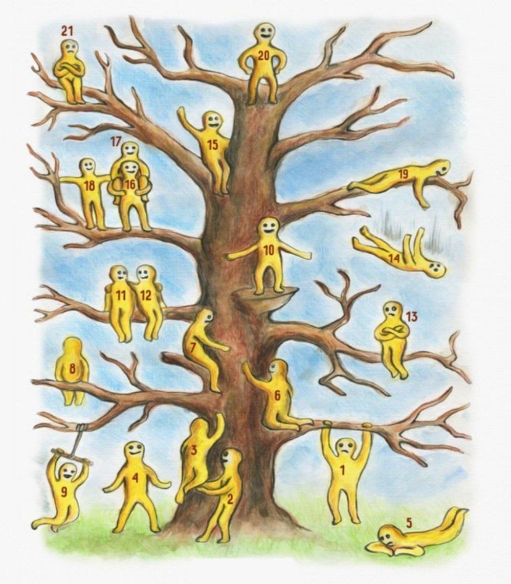 Внутреннее🧘♀️ состояние. Предлагаю вам сегодня поиграть и пройти тест на определение внутреннего состояния. Посмотрите на картинку с человечками и выберете себя! Где вы сидите на этом дереве? Этот тест метафорический, принцип похож на метафорические карты - вы смотрите на картинку и ассоциируете себя с каким-либо человечком🏃♂️ - так можно для себя понять, как вы себя сейчас ощущаете. Номер 13 или 21: Вы замкнуты, часто подвержены внутренним тревогам и избегаете частого общения с людьми. Номер 8: Вы любите уходить в себя, размышлять о чем-то своем🧐 и погружаться в собственный мир. Номер 10 или 15: У вас нормальная адаптация к жизни, вы находитесь в комфортном состоянии. Номер 14: Вы падаете в эмоциональную пропасть, скорее всего, подвержены внутреннему кризису. Номер 20: Вы прирожденный лидер🦸♂️ и хотите, чтобы люди прислушивались именно к вам и ни к кому другому. Номер 16: Вы ощущаете себя уставшим от необходимости поддерживать кого-то, но, возможно, вы увидели на
