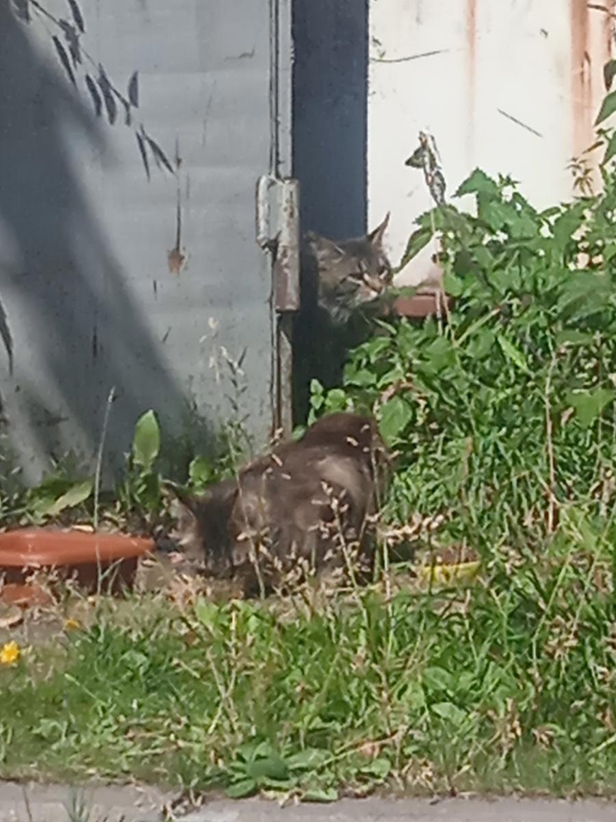 Сидеть рядом с ними днём в +30 было практически невозможно, тем более что при попытке подойти ближе они слиняли на крыши и исчезли. Но мы всё равно собрались, периодически обходили гаражи, кискискали и надеялись на чудо. Ближе к вечеру вытащили пенки, переноски и традиционный термос, на сей раз с супом 🙈 Наши подопечные явно были голодны, но подходить к людям всё так же не хотели. Девочки, на обходе, выяснили что прячутся коты под старый автобус, который закрыт на ключ и используется как склад хлама. Миски с водой и кормом перенесли полили вокруг валерьянки, сами для гарантии облились ей же. Мы же тогда не знали что мэйкунам на валерьянку вообще фиолетово. Зато на запах к нам пробились в компанию два дворовых кота. Серый Битюк и рыжий, который просто Рыжий.