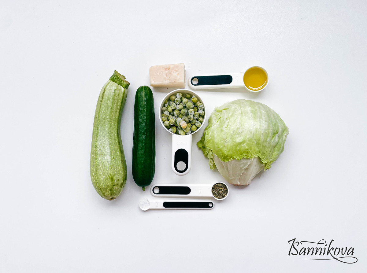 3. салат порвать или порезать средним размером, огурец и кабачок порезать дольками, толщиной 1 или 2 мм