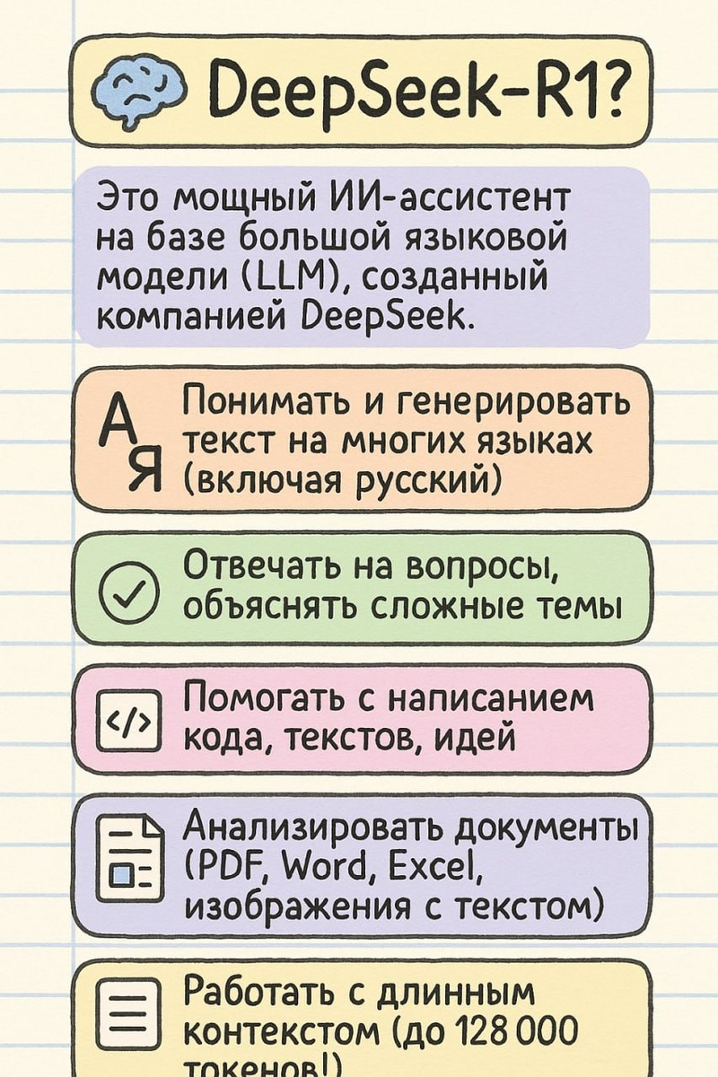 Когда в твоем ТГ в основном чатики всяческих нейроделов и ии-промтеров, кажется, что все вокруг все знают про ии и умеют пользоваться. Но недавно я узнала, что все не так и есть люди, которые не знают и не умеют. Посему я решила провести небольшой ликбез. Начну с чат-бота DeepSeek. Классный, бесплатный и без VPN. Подробности в инфографике ☝️