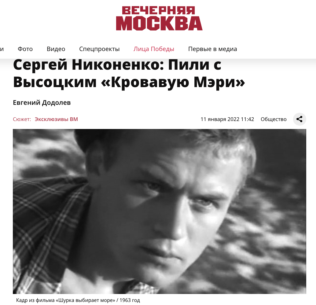 К прошедшему дню памяти Высоцкого. Напомнили мне в комментах про мою беседу с Никоненко. Я сейчас специально выложил видео фрагмент этого разговора: Разговор состоялся три года назад и ВЕЧЕРНЯЯ МОСКВА так и озаглавила то интервью: Сергей Никоненко: Пили с Высоцким «Кровавую Мэри».
