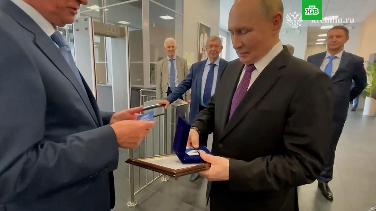 [ Смотреть видео на сайте НТВ ] В День Военно-морского флота президент Владимир Путин был награжден медалью Морской коллегии РФ «За верность российскому флоту». Награду главе государства вручил помощник президента, председатель Морской коллегии Николай Патрушев. В ходе скромной церемонии он объявил, что медаль Владимиру Путину вручается «за большой личный вклад в развитие морского флота Российской Федерации, укрепление морского могущества страны, поддержание стратегической и региональной стабильности в Мировом океане». Патрушев отметил, что это первая такая медаль Морской коллегии, ранее ей еще никто не награждался. Напомним, что коллегия была образована в августе прошлого года. Церемония награждения состоялась в фойе Центра единоборств Санкт-Петербургского государственного морского технического университета (СПбГМТУ) — Патрушев является его выпускником. [ Смотреть видео на сайте НТВ ]