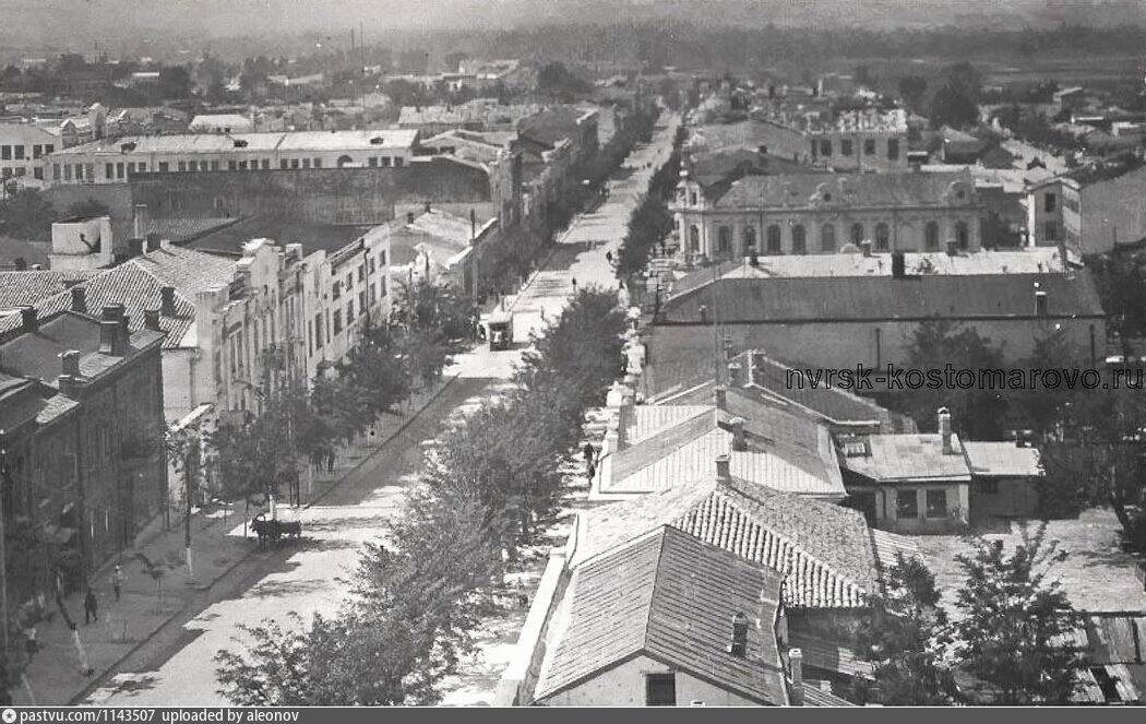 Тут панорамный вид на центральную улицу Советов. Мы видим Новороссийск с идеально спланированной застройкой, с домами XIX-XX века.