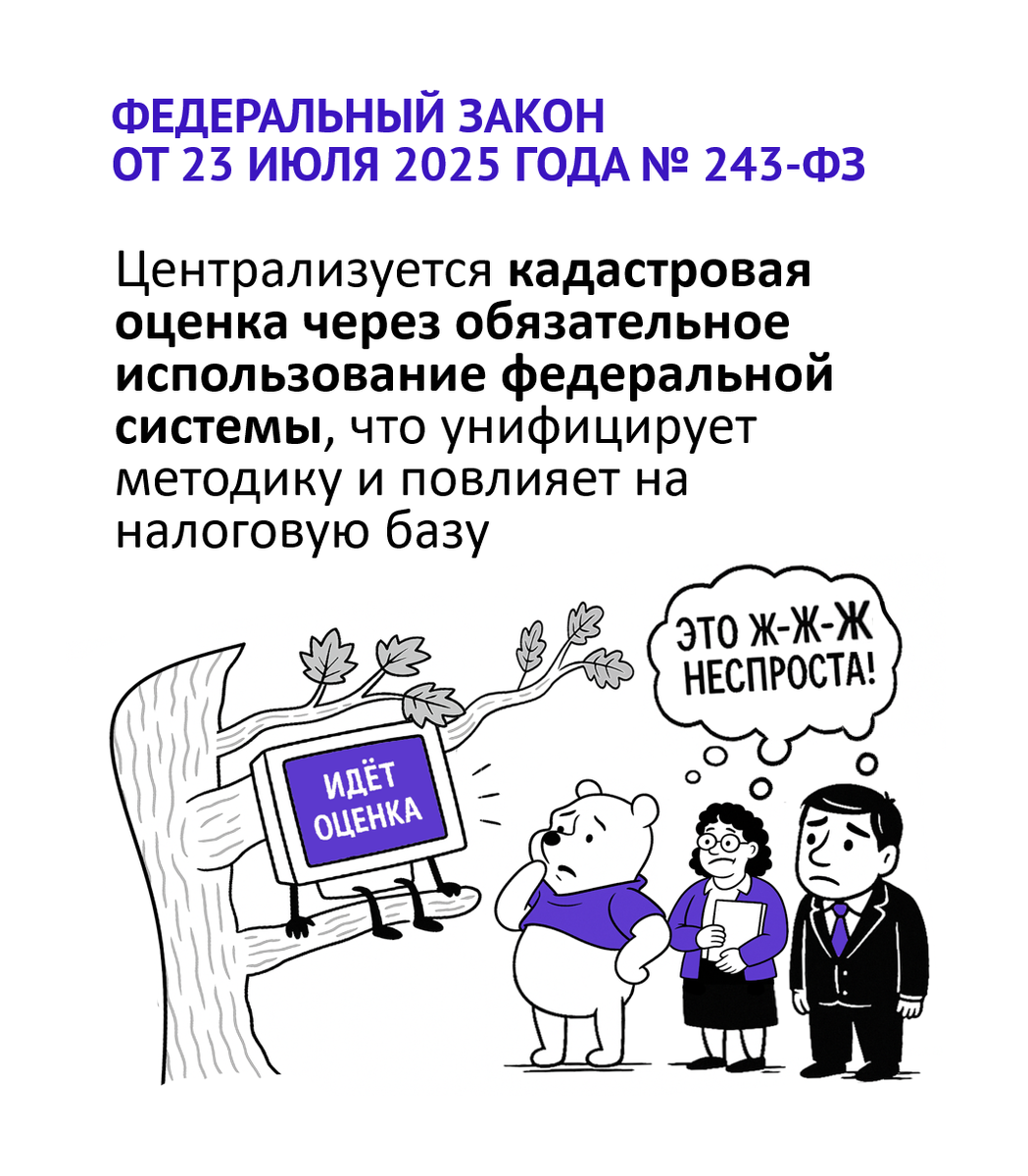 С 2026 года вводится единая цифровая система для определения кадастровой стоимости Федеральным законом от 23.07.2025 № 243-ФЗ. Для физиков оценка квартир, домов и земельных участков, налог на имущество будет рассчитываться исходя из новой оценки, что может повлиять на сумму в платежках. Для бизнеса, который владеет или арендует недвижимость (офисы, склады, производственные помещения, земельные участки), изменения в кадастровой оценке тоже имеют прямое значение для налоговой базы.