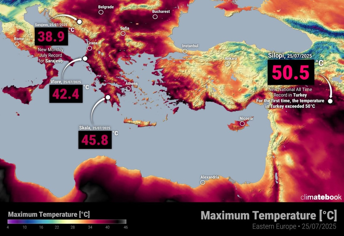 ☀️ Экстремальная жара на Балканах и в Юго-Восточной Европе Вчера, 25 июля, в Сараево, Босния, был установлен новый июльский рекорд +38,9 °C. В Турции установлен новый национальный рекорд температуры — 50,5 °C в Силопи. Это также первый случай, когда в Турции зафиксирована температура выше 50 °C