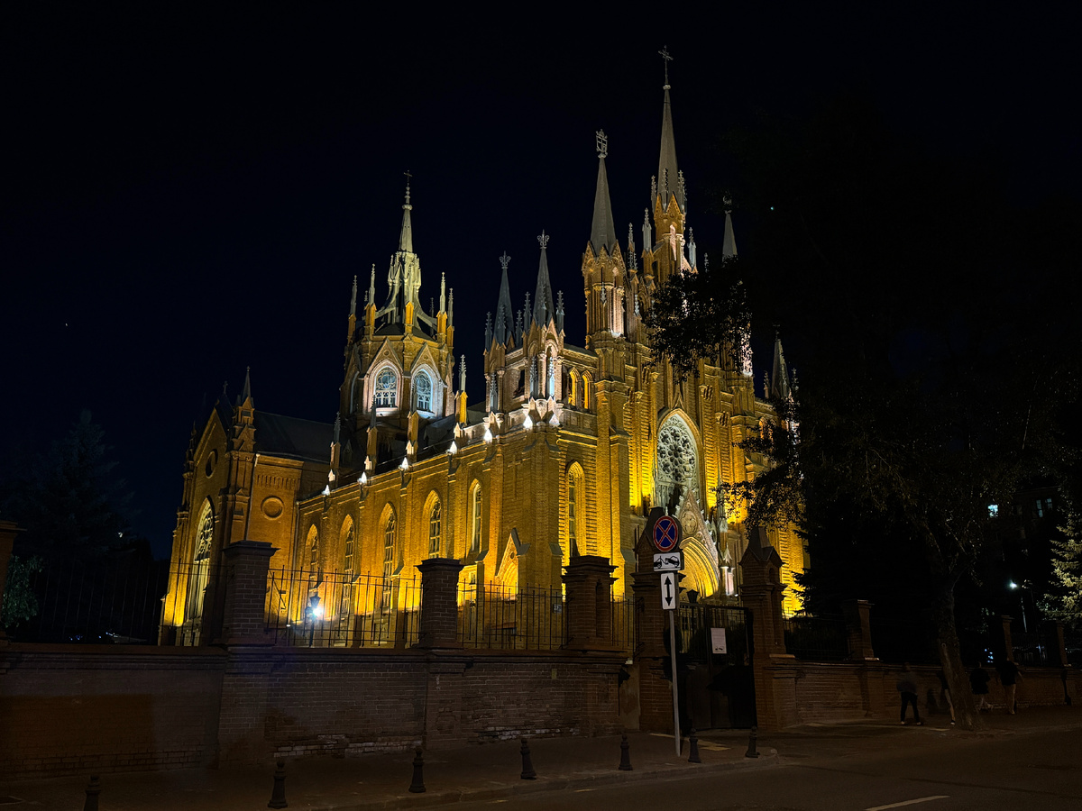 В данной статье речь как ни странно пойдет не о разного рода питейных и увеселительных московских заведениях, оставлять в которых деньги, время и здоровье мне давно уже не интересно. Сегодня мы с вами обсудим, какие места в столице интереснее всего выглядят после заката. Я специально обошел стороной Воробьевы горы, сталинские высотки, Новый Арбат и Кремль, потому что они и так вне всякой конкуренции. А вот Триумфальные ворота и Живописный мост, которые должны были быть в списке, пришлось исключить не по моей воле, так как во время ночного объезда Москвы их подсветка не работала. Связано ли это с экономией энергии или с чем-то другим - мне неведомо, но сей факт не мог не разочаровать. Итак, поехали. Начать хотелось бы с неповторимого Кафедрального собора Непорочного Зачатия Пресвятой Девы Марии, расположенного близ станции метро "Баррикадная". Построенный в 1911 году, он стал самым большим католическим собором в России. По своему прямому назначению ему удалось непрерывно послужить чуть