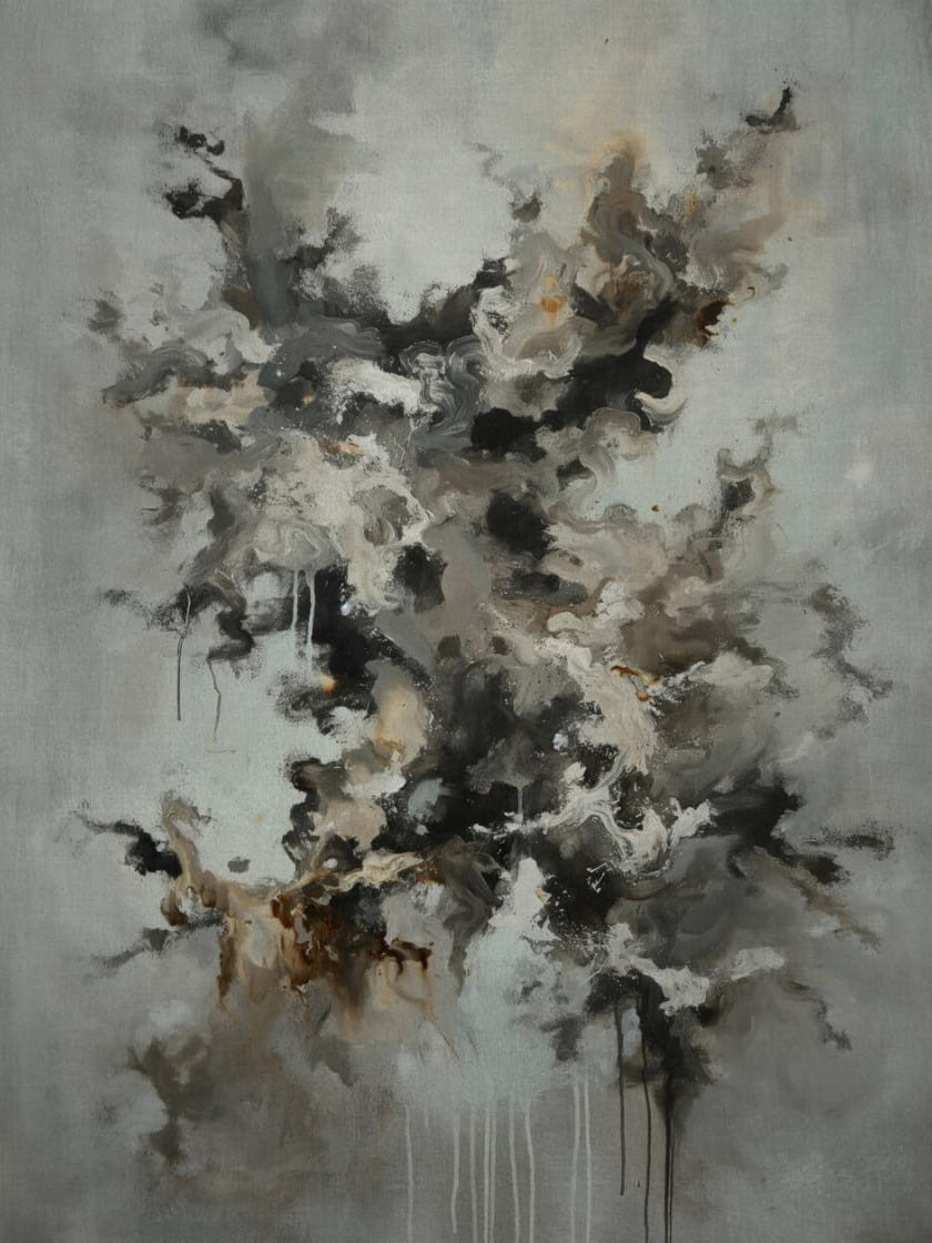 Произведение, в котором энергия движения и бесконечные переплетения форм превращаются в целый мир на холсте. Растекающиеся черные, серые и коричневые пятна создают динамичную композицию, в которой наблюдается гармония хаоса и порядка. Картина наполнена чувственностью и стремлением к свободному самовыражению, не ограниченному традиционными формами. Разнообразие текстур и насыщенные оттенки подчеркивают контрастность и драматизм, возникающий между светом и тенью. Неопределенные линии и формы, стремящиеся к абстракции, создают ощущение движущихся ветвей, словно живых, становящихся частью огромного пространства.