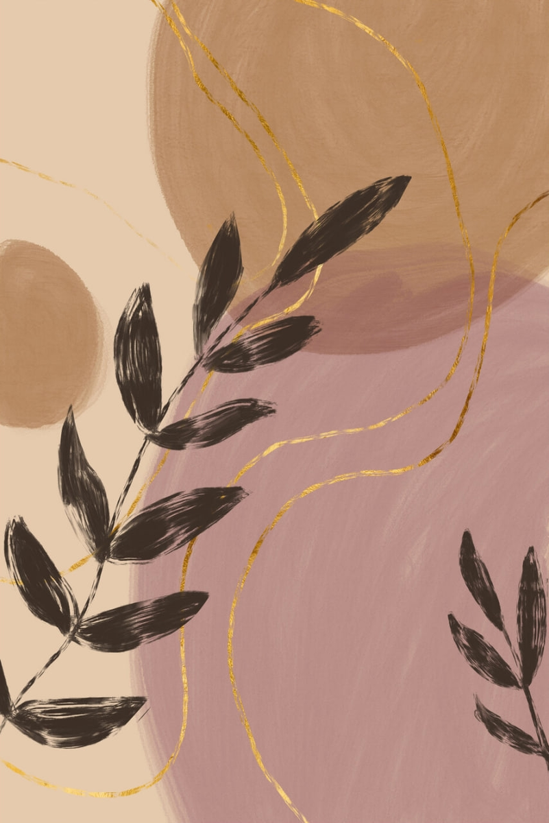 Картина сочетает в себе мягкие цветовые переходы и динамичные формы. На фоне пастельных тонов — от нежного персикового до пыльно-розового и охристого — располагаются стилизованные темные ветви с листьями. Поверхность полотна оживляют изящные золотистые линии, придающие композиции ритм и направленность. Образ листьев выполнен энергичными мазками, что контрастирует с плавностью цветовых пятен. Работа вызывает ощущение спокойствия и организованности благодаря сбалансированной композиции и умеренной палитре.