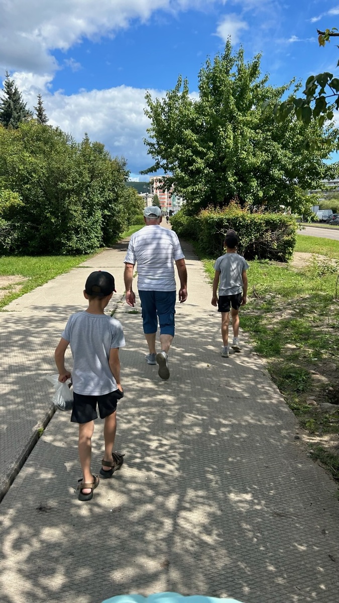 Днём отправились кататься на пароме с дедушкой. Это был путь через реку Кан на правый берег. Дедушка, кстати, впервые в жизни прокатился на пароме.