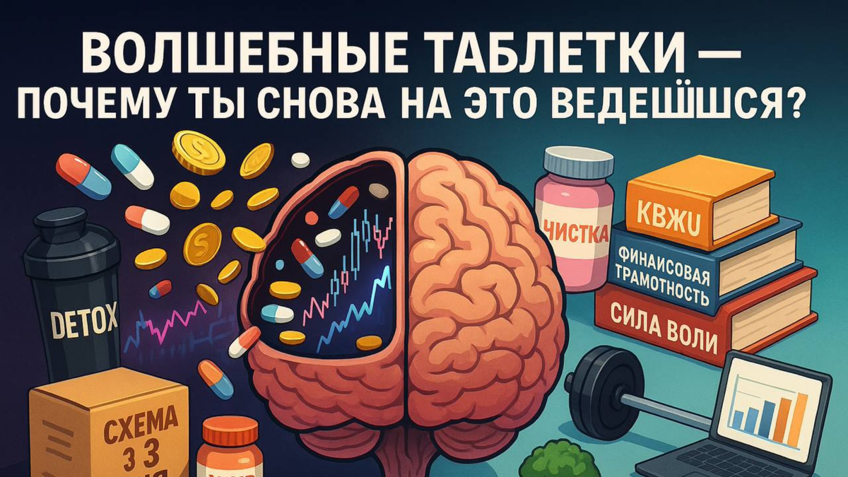 Легкие деньги, детокс-программы без усилий, жиросжигающие пластыри, инвестиционные пирамиды, курсы с обещанием пассивного дохода — это лишь разные формы одной и той же психологической ловушки.