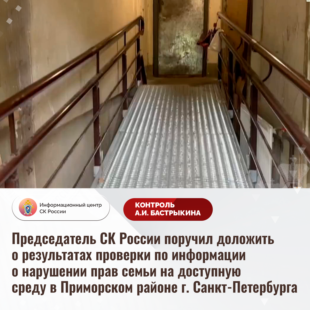 Председатель СК России поручил доложить о результатах проверки по информации о нарушении прав семьи на доступную среду в Приморском районе г. Санкт-Петербурга В СМИ сообщается о нарушении прав семьи из Приморского района города Санкт-Петербурга на доступную среду. Местный житель, его супруга, являющаяся инвалидом, и их дочь, передвигающаяся на инвалидной коляске, проживают в многоквартирном доме, подъезд которого не оборудован пандусом. Ранее граждане за свой счет установили подъемный механизм, однако его эксплуатация невозможна в связи со значительной высотой перепада между платформой и землей. Многочисленные обращения в различные инстанции результатов не принесли, мер к разрешению ситуации не принято. В ГСУ СК России по городу Санкт-Петербургу по данному факту проводится процессуальная проверка. Председатель Следственного комитета Российской Федерации Александр Иванович Бастрыкин поручил руководителю ГСУ СК России по городу Санкт-Петербургу Павлу Сергеевичу Выменцу доложить о промеж