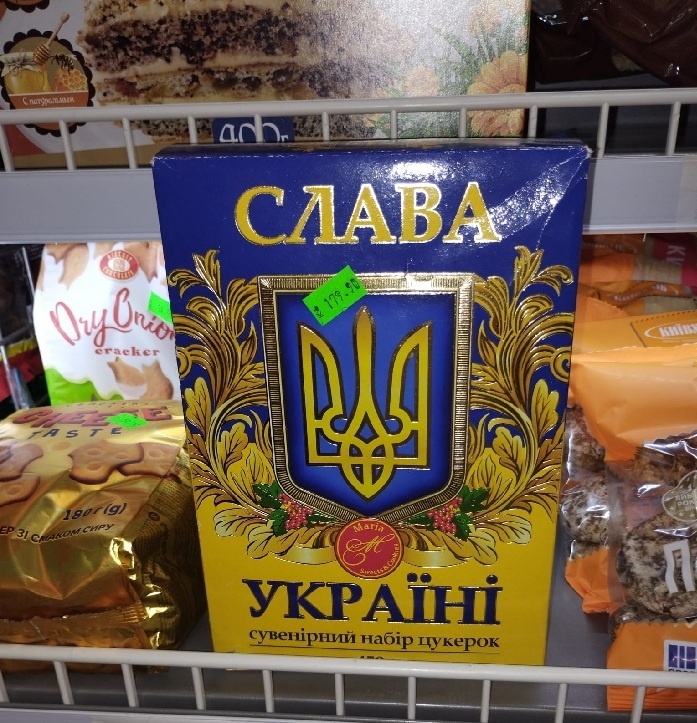 Вот этот продукт я увидел в одном из Европейских магазинов. Написано на нем Слава украине. А дальше собственно описание продукта: сувенирный набир цукерок. То бишь, конфет... Сразу скажу, что этот "набир", как и все, произведенное в этой сошедшей с ума стране, несопоставимо ни с какой логикой.. То есть, если это конфеты, то их нужно есть. Но это не просто конфеты, как указано в описании, а сувенирные цукерки, и, значит есть их не нужно, а нужно повесить на стенку и периодически смотреть, для пущей сладости произнося как заклинание бандеровский лозунг. А почему этот набир называется по-бандеровски? То есть, с таким же успехом их можно было назвать Хайль Гитлер? Или, еще лучше, Гитлер капут.... А чему слава? Стране, которая превратилась в сборище террористов? Мошенников? Как указывают разведывательные агентства, в этой "украини" около 150 центров, которые занимаются электронным и просто грабежом своих и чужих. Обворовывают при помощи каких-то мутантов-дропперов пожилых людей в Росси