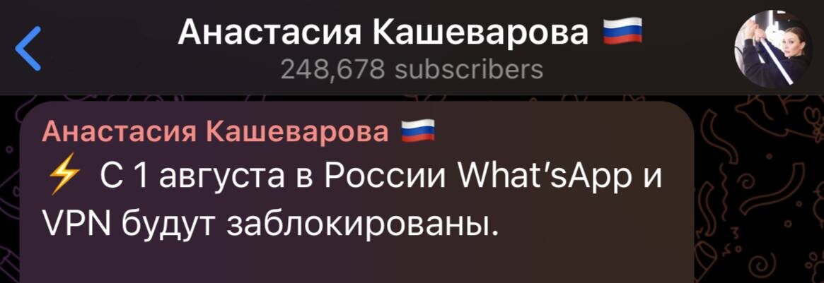 🇷🇺 WhatsApp и VPN под угрозой блокировки? Журналистка Кашеварова заявила: в России с 1 августа могут заблокировать WhatsApp и сервисы VPN. Она назвала WhatsApp «гнилым мессенджером», обвинив в массовом воровстве денег. 🚫 VPN под прицелом за «слишком много свободы» и доступ «враждебным структурам». Заявления серьезные, но пока без официального подтверждения. ⚠️ Если ваша работа, связи или полжизни зависят от этих сервисов, подумайте о плане Б. Будьте готовы. °Telegram • Zen • Bastyon° ✒️Предложить новость
