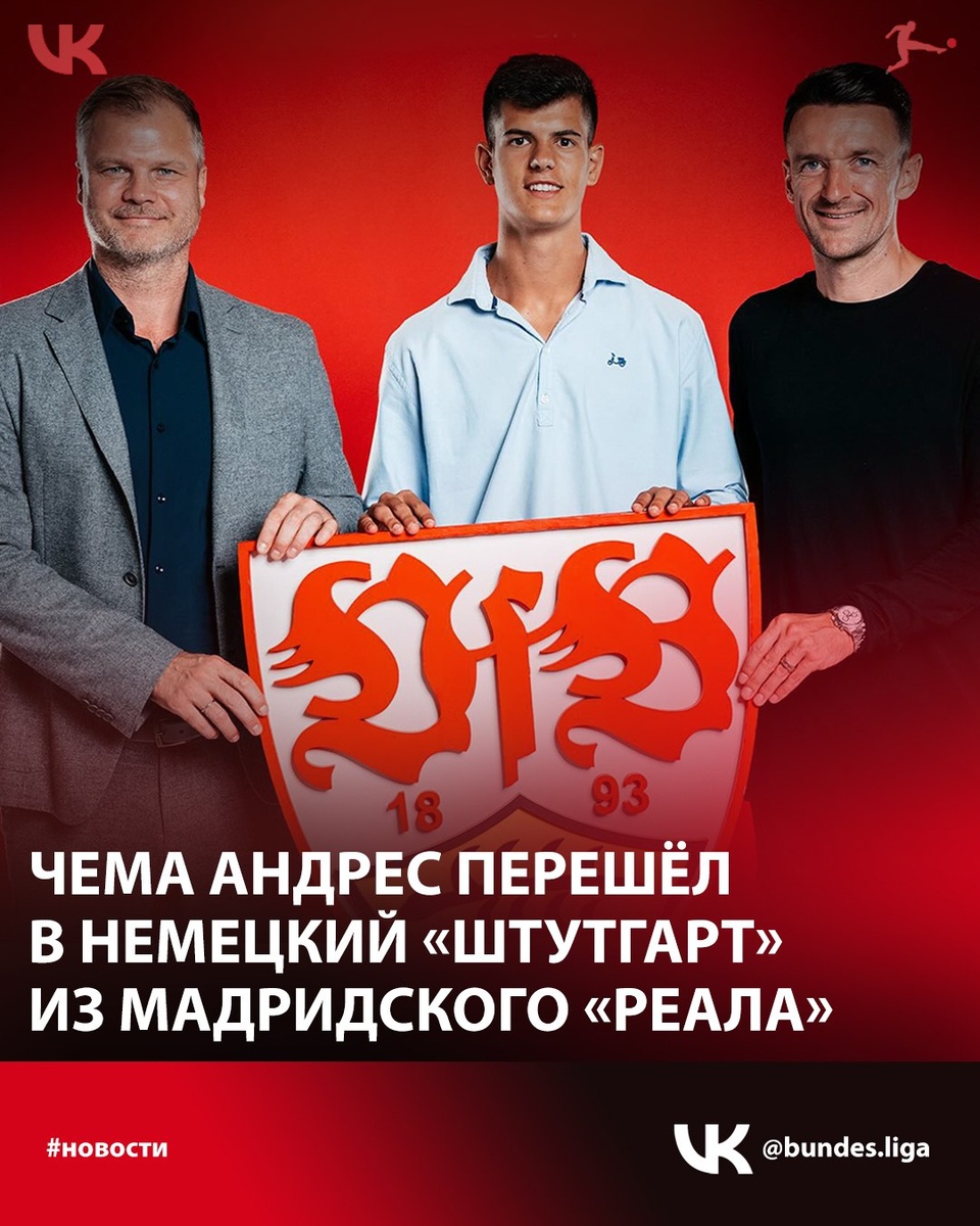 🔥 Официально: «Штутгарт» подписал контракт с молодым игроком «Реала». Чема Андрес перешёл в «Штутгарт» из мадридского «Реала». 20-летний полузащитник подписал контракт с клубом Бундеслиги до 2030 года. 💬 «Мои первые впечатления очень положительные — я рад быть здесь и с нетерпением жду первой тренировки со своими новыми товарищами по команде», — сказал Андрес, который будет выступать под номером 30.