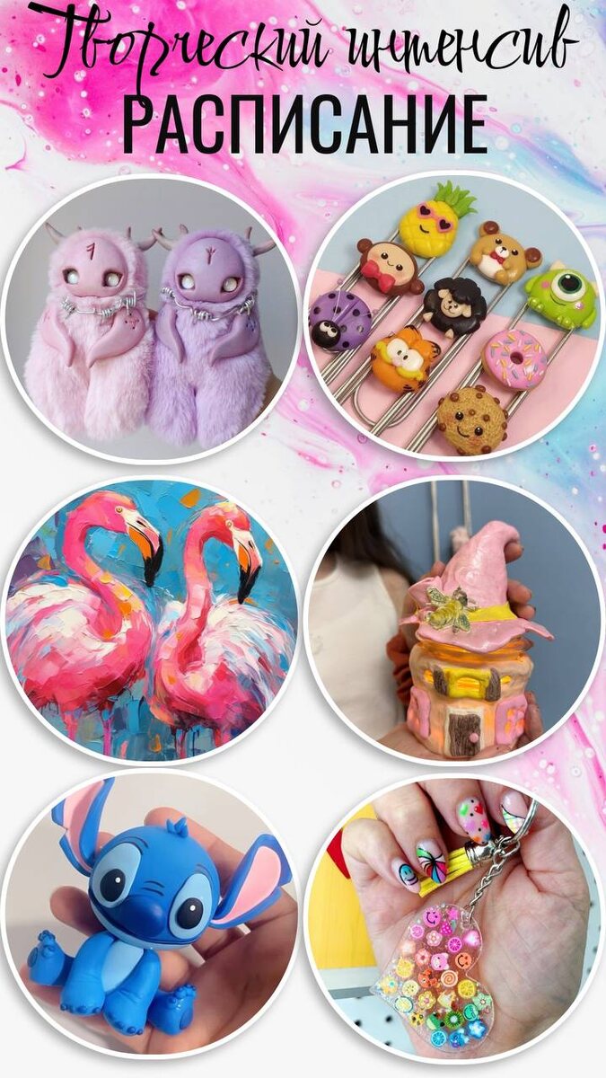 Расписание мастер-классов «Творческого интенсива» с 28 июля . Пн. 28 июля 10:00 живопись «Фламинго» (холст, акрил) - 900 руб. 12:00 лепка фигурок из полимерной глины «Стич» - 900 руб. Вт. 29 июля 10:00 брелоки в технике «Макраме» - 600 руб. 11:00 лепка закладок из полимерной глины -600 руб. 12:30 живопись, сюжет на выбор ( холст, футболка или шоппер)- 1200 руб. Ср. 30 июля 10:00 роспись фигурок: Лабубу, Стич, Грут - 600 руб. 11:00 изготовление ароматного фигурного мыла: Лабубу, Стич, слоник, котик и др. - 600 руб. 12:00 домик-фонарик из полимерной глины - 1200 руб. Чт. 31 июля 14:00 изготовление свечей в кокосах + аромасаше - 1000 руб. 16:00 фактурная живопись «Рыбка» - 900 руб. Пт. 1 августа Игрушка в смешанной технике - 1300 руб. 10:00 рисуем эскиз будущей игрушки 10:30 лепка головы и лапок из полимерной глины + амулет 12:00 шьем тело из меха 13:20 сборка игрушки 🪙 Стоимость: 5 дней -6000 руб. 1 день - 1600 руб. Можно посещать мастер-классы выборочно . В стоимость включены в