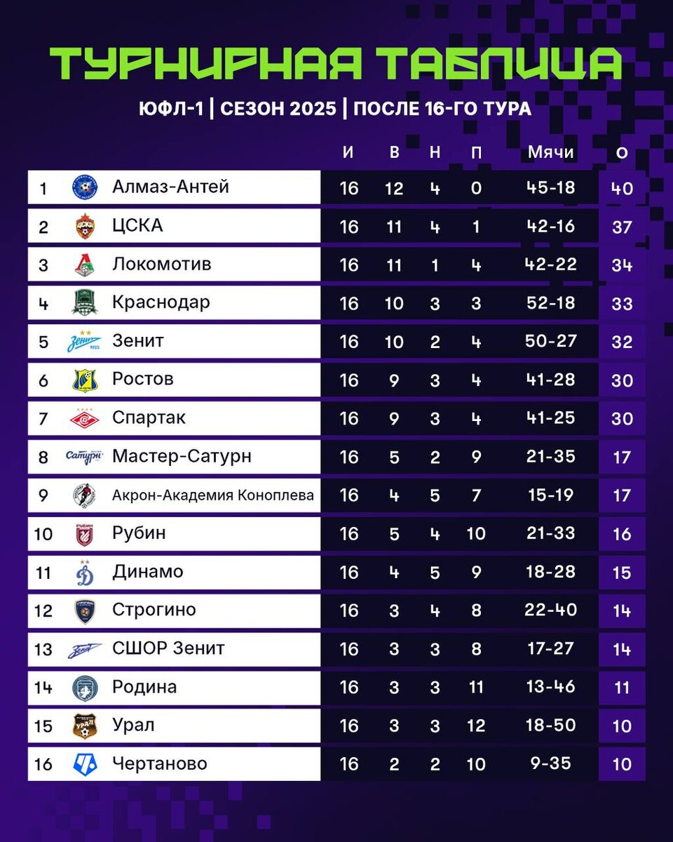 Шестнадцатый тур – всё. Таблицы и результаты – на месте 🏆 «Алмаз» сохраняет лидерство в ЮФЛ-1, но ЦСКА дышит в спину. «Краснодар» и «Динамо» делят вершину ЮФЛ-2. ЦСКА – первый в ЮФЛ-3. Такие дела 🤙 Что думаешь о туре?