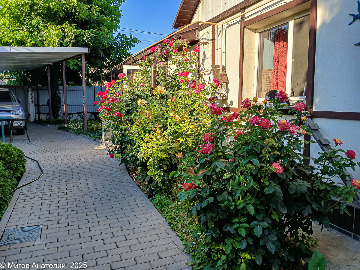 Жара в Старом Крыму африканская. Вчера в полдень у нас в саду было +37 в тени. Для меня это чересчур. Я до +33 совсем не страдаю, но если выше, то ещё терпимо, но уже жарко. А когда +35 и выше, спасаюсь под кондиционером. Вот так, чтобы уже в июле каждый день жарило за 35, такого лета я здесь в Крыму не припомню. Хотя это всего наше десятое лето тут, думаю, впереди ещё много открытий. Как ни странно, розам такая погода по душе. На заглавном снимке три наши розовых куста, что растут под окном кухни-столовой. Должен заметить, что это вторая волна цветения, которая обычно всегда слабее первой, выпадающей на май-июнь. Но тут такого даже и не скажешь. Кошки такой жаре тоже не рады. Маруся, как обычно, обитает на крыше автомобиля. Спустится на землю, зайдет в дом, чтобы поесть, и снова на свой наблюдательный пункт. Даже на улицу уже несколько дней не выходит. Кошка Кокошка весь день проводит в доме, в комнате с кондиционером. Либо из окна наблюдает за флорой и фауной, либо спит на холодильни