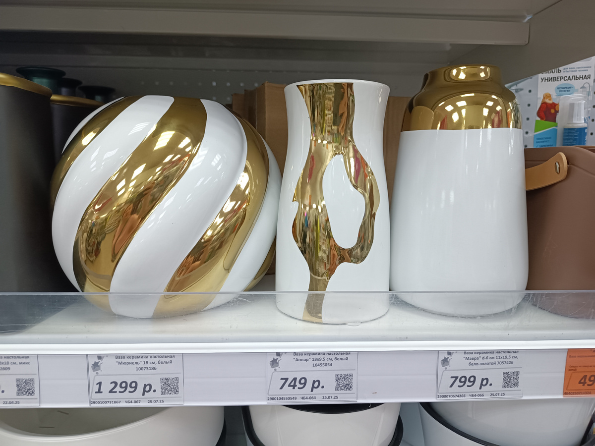 Приветствую! Я думала, честно говоря, что ничего особенного не увижу, а тут много интересного появилось на полках в магазине Галамарт. Один день отдохнем от Фикс Прайса и завтра продолжим. А пока смотрите интересные товары из этого магазина. В основном покажу по кухне, а именно посудный отдел. но в начале все же немного вазочки. Смотрите, какие прелести появились с позолоченными элементами. Кто-то любит такие для украшения и ярких пятен дома. Была я как-то в гостях у одной знакомой, интерьер был нормальный, даже строгий я бы сказала. в серых и коричневых оттенках. Но увидела на кухне пару товаров таких ярких с позолотом и поняла, что это просто пятна настроения. Я сама вообще не любила все блестящее, тем более под цвета золота. Но там смотрелось очень кармонично с белокрасными цветами. Во всем нужна мера, тогда не будет портить, а будет только украшать. вот еще одна ваза уже не с белыми полосками, а прозрачная стеклянная ваза с позолоченной покраской. Опять появились эти силиконов