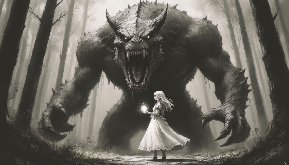 Я вижу монстра как отражение самой этой девочки, он сидит внутри нее, н вышел показаться, он и есть она. Может как раз поэтому она его и не боится - это хорошо знакомая ей сущность, и сейчас она настолько сильна, что готова посмотреть этому демону в глаза и даже приручить его.