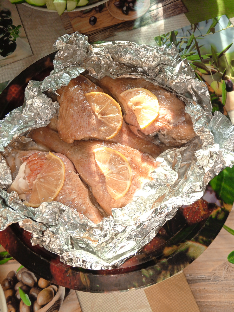 Решили приготовить рыбу на даче , на решётке для гриля. В этот раз решили выбрать морского окуня. В первую очередь разморозили, почистили от плавников и остатков чешуи. Дальше, готовим маринад. В этот раз взяли только соевый соус и соль. После заворачиваем в фольгу и помещаем в решётку для гриля. И далее ставим решётку мангал с углями. А , забыл ещё, перед заворачиванием в фольгу, добавляем лимонные дольки. Получилось вкусно. До новых рецептов!