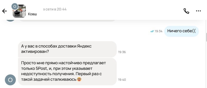 Я просто в бешенстве! Целый час убила на переписку с поддержкой Авито — и всё впустую. Никакого толку... Неделю назад у меня случилась досадная история: покупатель не смог оформить заказ через Яндекс Доставку, хотя у нас обоих пункты выдачи — буквально в двух шагах. Раньше я не раз отправляла через них заказы, но тут система вдруг отказалась показывать этот вариант. Я даже попробовала оформить доставку с другого аккаунта — та же проблема. В итоге покупатель ушёл, а я осталась с вопросом: почему так вышло? Списала всё на временный глюк самого Яндекса — мало ли, у них часто бывает. На следующий день товар заказали через почту, и я немного успокоилась. Сегодня ситуация повторилась: покупатель пытался оформить доставку ковшика через Яндекс или Boxberry, но Авито категорически предлагал только 5Post. Это уже не похоже на случайный сбой - система явно что-то глючит. Проверила с другого аккаунта — ситуация та же: только 5Post и никаких альтернатив. Странно, ведь раньше всё работало нормальн