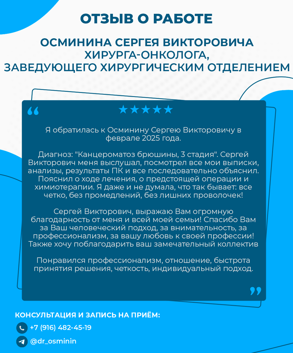 Пациентка с канцероматозом брюшины написала о первом визите к Сергею Викторовичу: «Всё последовательно объяснил. Без промедлений, без проволочек». А потом – операция, химиотерапия, и, главное, уверенность, что всё делается правильно. Такие слова – не просто благодарность. Это знак доверия. А для нас – подтверждение, что делаем всё верно. Консультация и запись на приём: Осминин Сергей Викторович – хирург, онколог, заведующий хирургическим отделением https://t.me/dr_osminin +7 (916) 482-45-19 Другие отзывы вы можете прочитать по ссылке: https://prodoctorov.ru/moskva/vrach/434180-osminin/