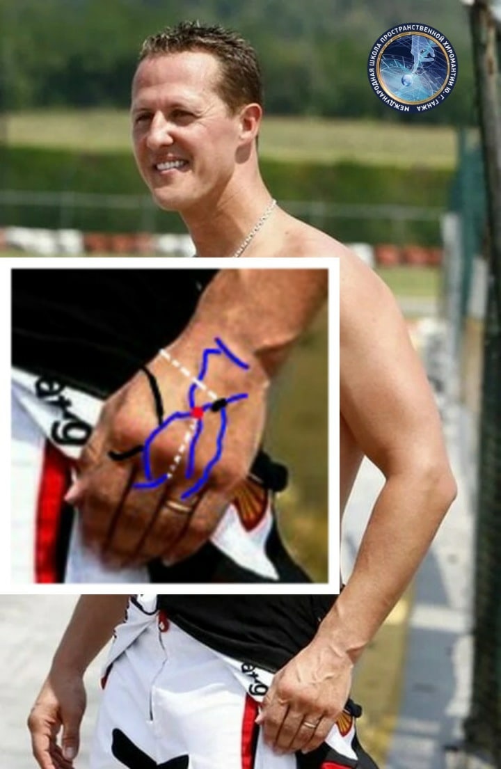 ИнновойИнЭЛЬ ШУМАХЕР. ВЕНОЗНЫЙ РИСУНОК. 🚩 🖍Он с детства был рожден для гонок. В 5 лет он лихо управлял картом, а славная спортивная биография началась уже в 10 лет. Он любил гонки всем сердцем. Рука, наполненная силой воли, характером, лидерскими качествами, коммуникативными способностями, с прекрасными признаками жизнелюбия и славы. 🖍Но в 36 лет он терпит первую серьезную неудачу в гонках и от линии Сердца, на левой руке, к линии Ума образуется линия короткого замыкания (красным). В этом возрасте в отношениях и в семейном плане у спортсмена все шло замечательно, а вот именно неудача в любви всей его жизни - в гонках и, являющейся безусловно его сильной эмоциональной травмой - терпит провал. 🖍С этого возраста неудачи в карьере только начались и мы видим на левой руке синюю веточку от линии Жизни, направленную вверх и упирающуюся в судьбу, которая разделяет его жизнь на до и после, время победителя и побежденного, она же и находится в связке с линией короткого замыкания. С это