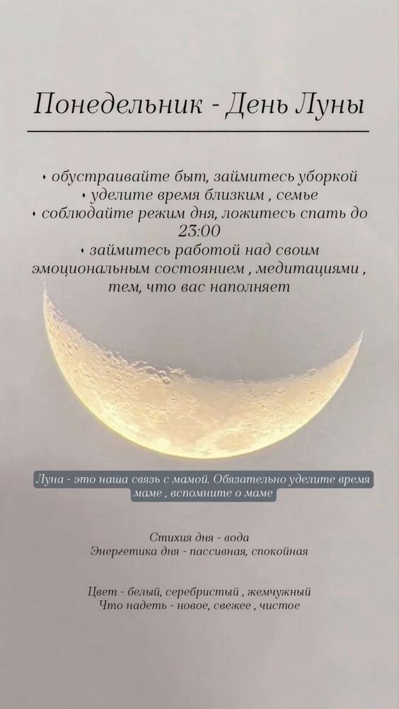 ❤️ Понедельник - день тяжёлый? 🤔 Только не для тех, кто в нём родился! 😉 Луна – женская планета (управитель понедельника), управляющая эмоциями, интуицией, внутренней гармонией, материнством, уважением, связью с матерью и семейным благополучием. Она наделяет глубиной чувств, развивает восприимчивость и способствует раскрытию экстрасенсорных способностей. 🌙 Характер людей, рожденных в понедельник Понедельник часто называют «тяжёлым» днём – он следует за выходными, и многим сложно переключиться на рабочий ритм. Однако те, кто родился в этот день, находятся под сильным влиянием Луны, что наделяет их особой эмоциональностью, тонкой душевной организацией и мягкостью. Такие люди легко адаптируются к переменам и умеют находить общий язык с разными характерами, но редко стремятся к лидерству. Они подсознательно ищут надёжных спутников жизни – тех, кто сможет их поддержать и защитить. Обладая живым воображением, «понедельничные» люди часто реализуют себя в творчестве. Главные ценно