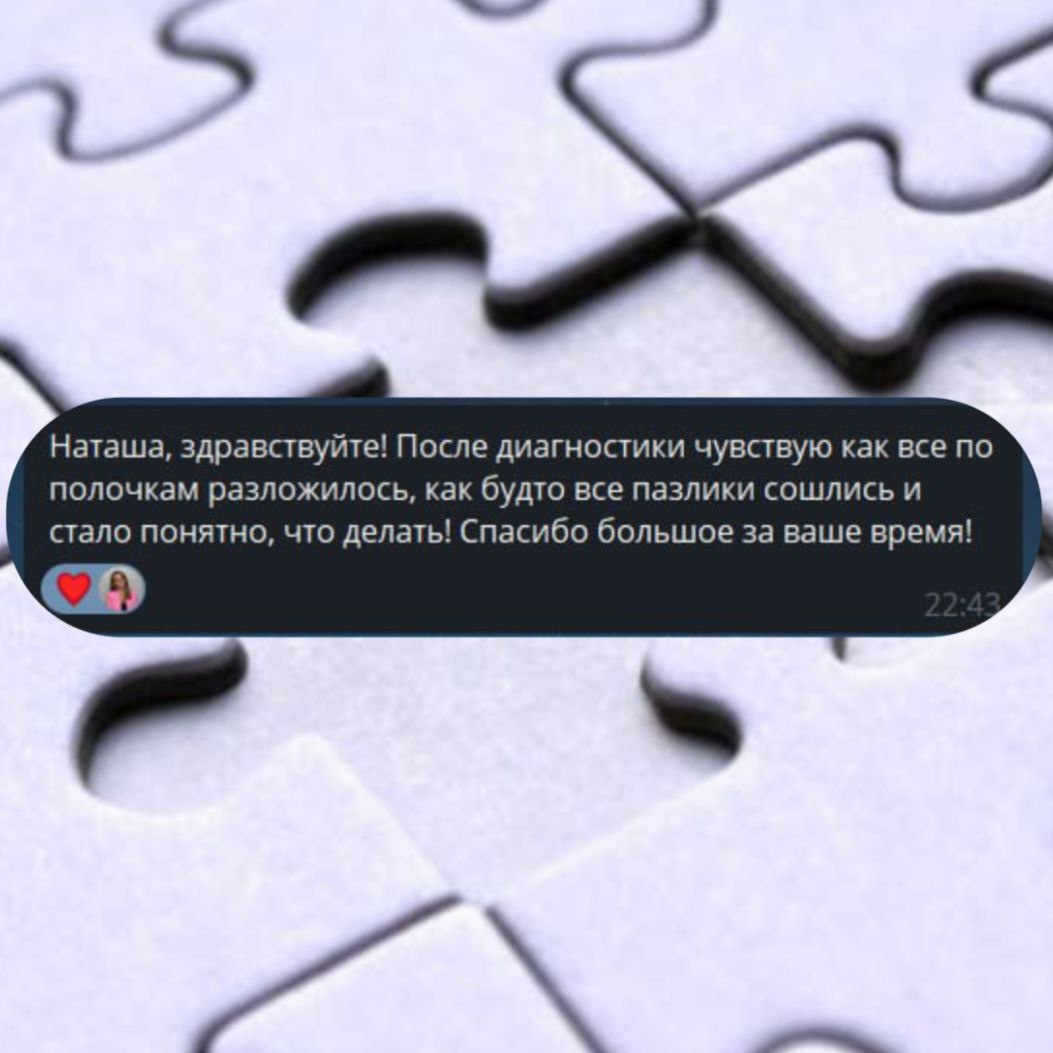 Наташа, здравствуйте! После диагностики чувствую, как все по полочкам разложилось, как будто все пазлики сошлись и стало понятно, что делать! Спасибо большое за ваше время!