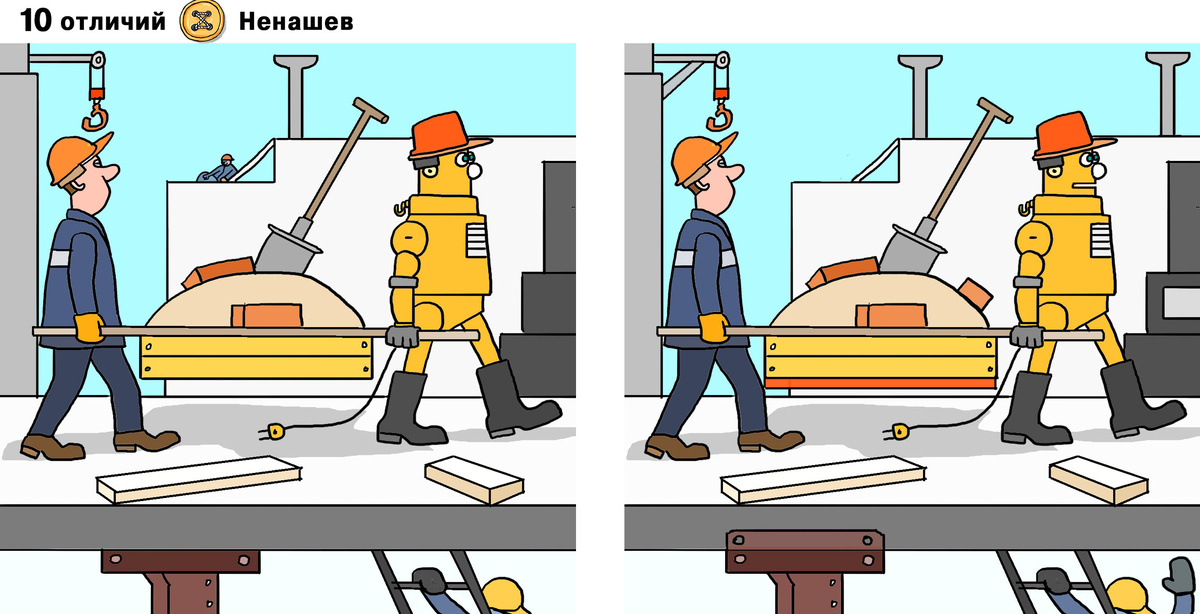 Друзья, у нас такой тест. Робот помогает человеку. Или наоборот, человек помогает роботу. Пока найдём 10 отличий, разберемся, кто надёжнее.