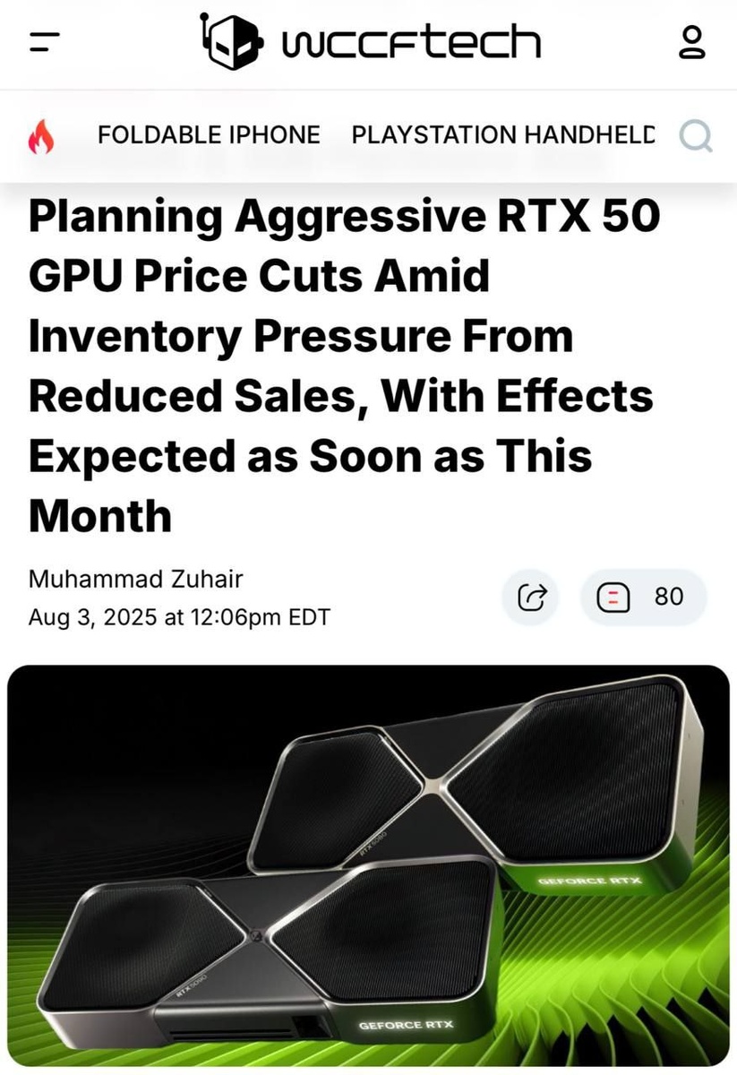 Видеокарты RTX 50XX сильно подешевеют — Nvidia и партнёры планируют снижение цен на всю линейку. По словам китайских инсайдеров, карточки за оверпрайс оказались даже близко не настолько востребованными, как ожидал дядя к кожаной куртке — теперь ситуацию планируют спасать агрессивным демпингом. При этом цена на 5090 и 5080 в США все ещё на 50% выше рекомендуемой — наглые перекупы надеются заработать на несчастных геймерах. По слухам, ценопад запланирован на конец августа — надеемся и копим.