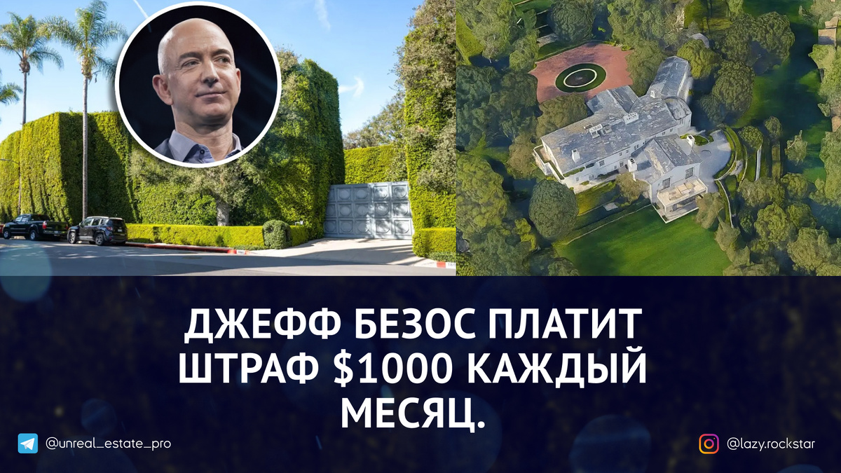 Ты стоишь перед домом в Беверли-Хиллз — и не видишь его. Ещё бы: Безос окружил свой особняк гигантской живой изгородью. Закон штата ограничивает высоту заборов и живых изгородей на переднем дворе до 3.5 футов (около метра), но здесь — близко к 20 футам (~6 м). заборной стены он просто платит $1 000 каждый месяц — $12 000 в год. Это штраф, но по факту они считают его стоимость просто стоимостью приватности. Безос купил этот участок в 2020 году (обошёлся он ему в $165–175 млн). Изгородь была уже там, но он не стал её убирать. Для богатых людей такие штрафы не работают как наказание — это просто новый «сервис».