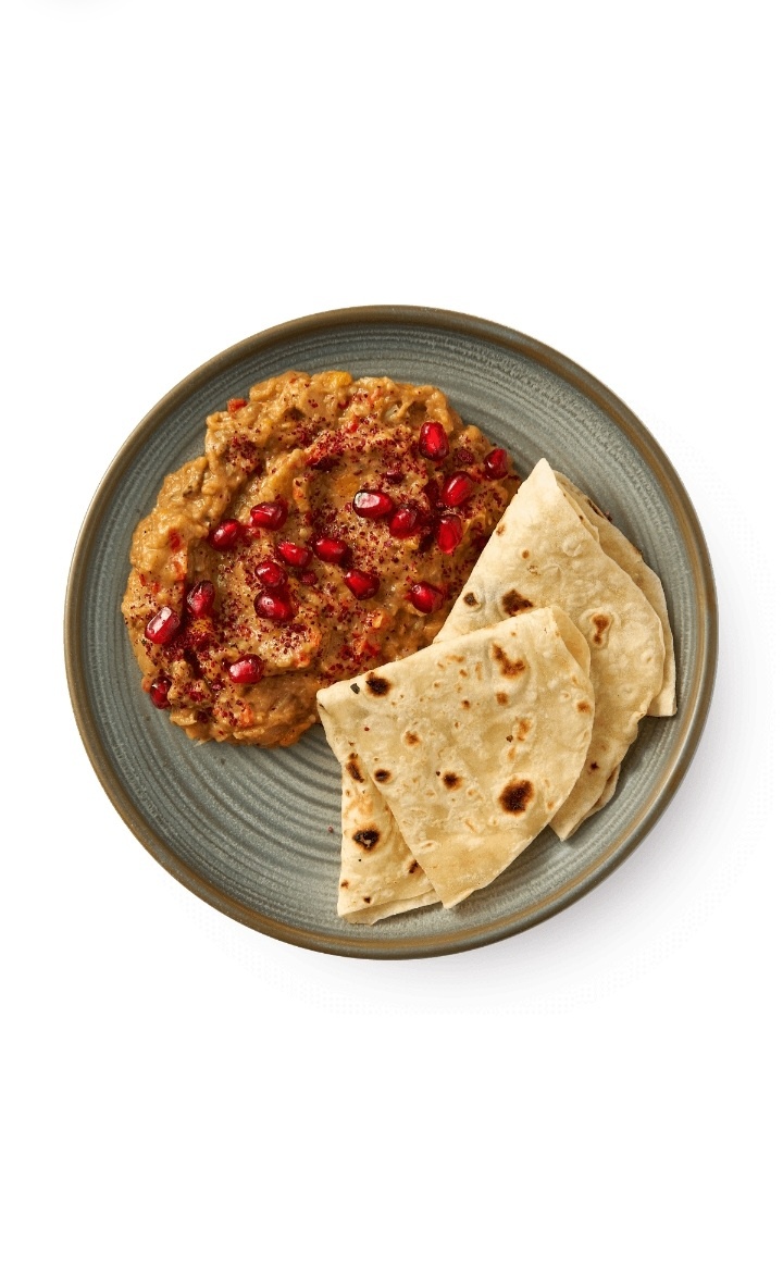 Вам понадобится на 4 порции: баклажаны — 4 шт.; чеснок — 1 головка; тахини — 1 ст. л.; лимон — 1 шт.; оливковое масло — по вкусу; соль — по вкусу; чёрный перец — по вкусу; кориандр молотый — по вкусу; паприка молотая — по вкусу; свежая кинза — для украшения; зёрна граната — для украшения. Приготовление: Проткнуть баклажаны вилкой, чтобы они быстрее запеклись и не лопнули. Полить головку чеснока кунжутным или оливковым маслом, посыпать солью и завернуть в фольгу. Выложить чеснок и баклажаны на противень, по отдельности заверните в фольгу. Запекать при 160 °C в течение 35–40 минут. Остудить, затем извлечь мякоть из баклажанов и мелко её порубить. Очистить чеснок и мелко его нарезать. Добавить в баклажанную массу тахини, натёртую цедру лимона, сок половинки лимона, оливковое масло, соль, перец, кориандр и паприку по вкусу. (А можно заменить эти приправы хмели-скнели и уцхо-сунели). Перемешать до однородности и пробить блендером до нужной текстуры. Для подачи переложить бабагануш в м