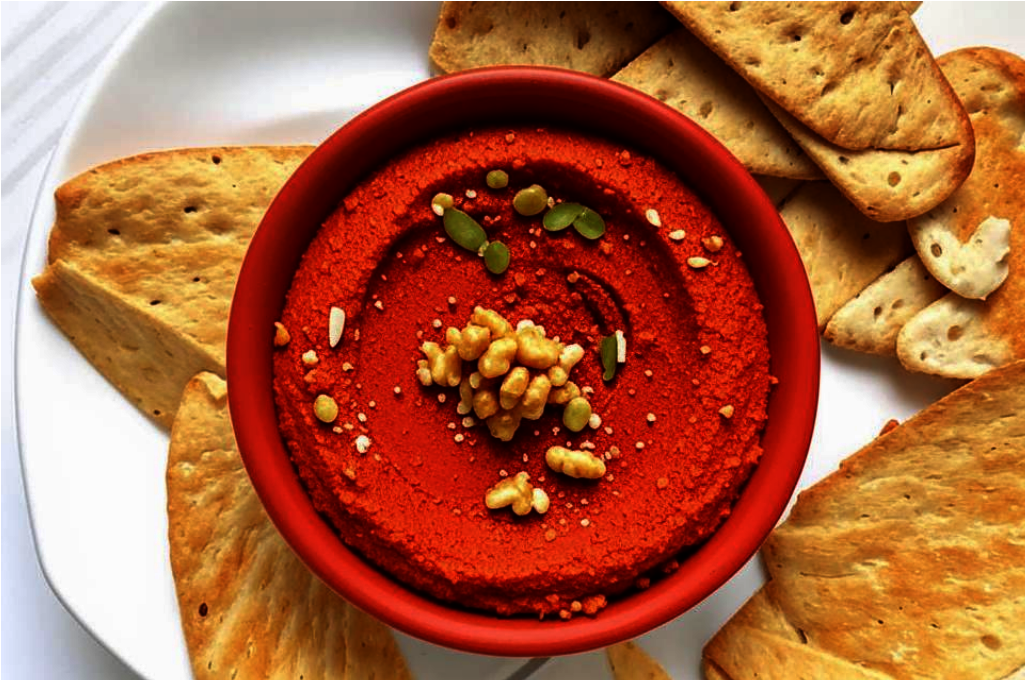 Ингредиенты: перец болгарский — 4–5 шт.; орех грецкий — 0,5 стакана; лук репчатый — 1 шт.; чеснок — 2–3 зубка; масло оливковое — 0,5 стакана; сок лимонный — 1–2 ст. л.; паприка — 1 ст. л.; кумин — 0,5–1 ч. л.; сахар — 1 ч. л.; соль морская — по вкусу; перец чёрный молотый — по вкусу; перец чили — по вкусу. Приготовление: Овощи помыть и обсушить. Перец поместить в разогретую до 180 градусов духовку и запекать до характерных подпалин на кожице или до готовности. Обжарить грецкие орехи минут 5–7. Лук мелко нарезать и обжарить до готовности. Добавить чеснок и готовить ещё 1 минуту. Готовый болгарский перец очистить от кожицы. Если это затруднительно, переложить ещё горячий перец в плотный полиэтиленовый пакет и оставить минут на 5–10. После такой процедуры кожица хорошо отделится от мякоти перца. Очистить перец от семечек и плодоножек. Переложить в миксер обжаренные орехи, лук с чесноком, запечённый перец, все специи, соль по вкусу и добавить немного лимонного сока. Перебить блендером