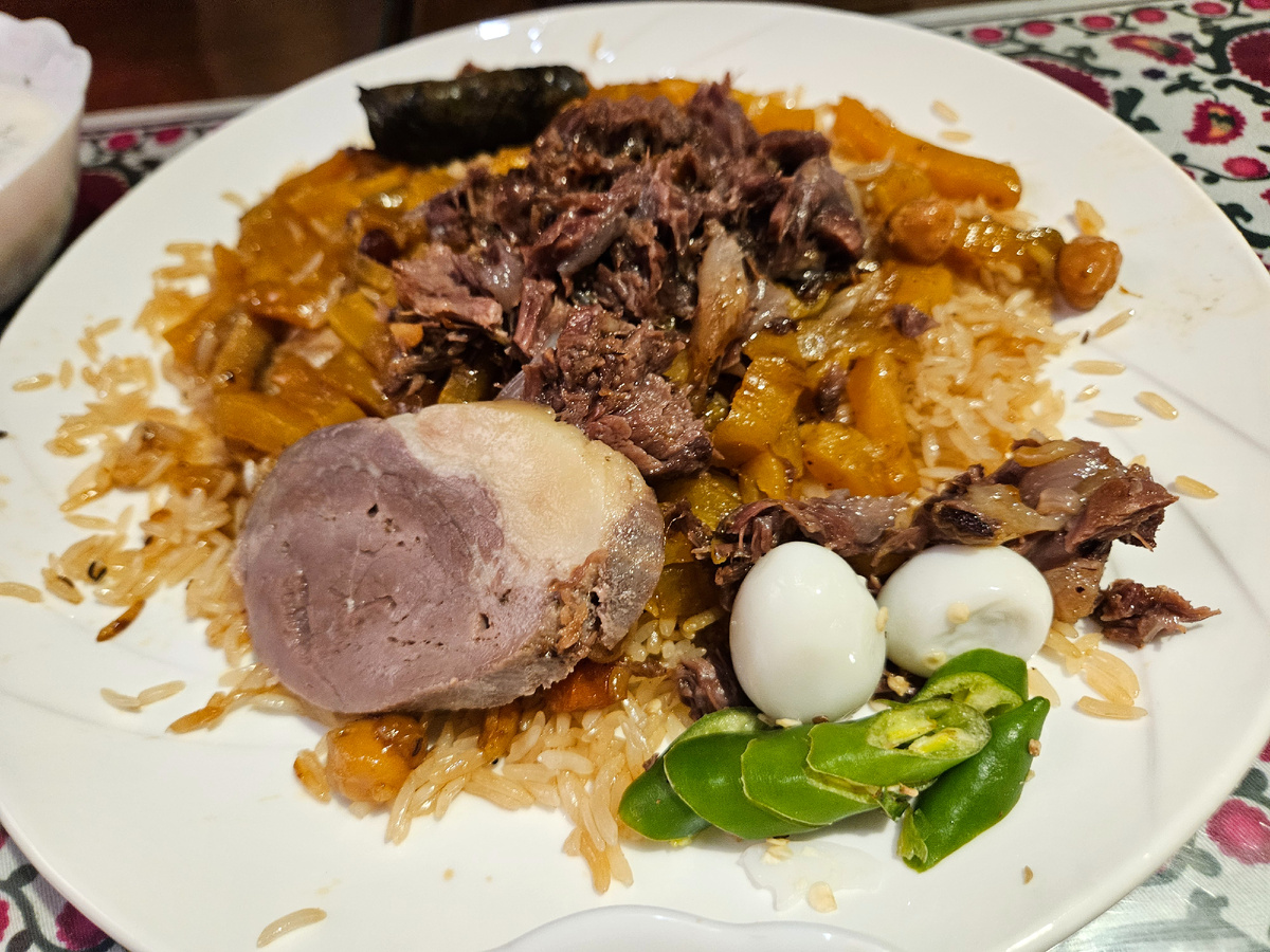 Традиционные дополнения: Самаркандский плов часто подают с салатом из свежих помидоров и лука ("Ачик-Чучук" или "Шакароб") и свежим узбекским хлебом (лепешкой).
