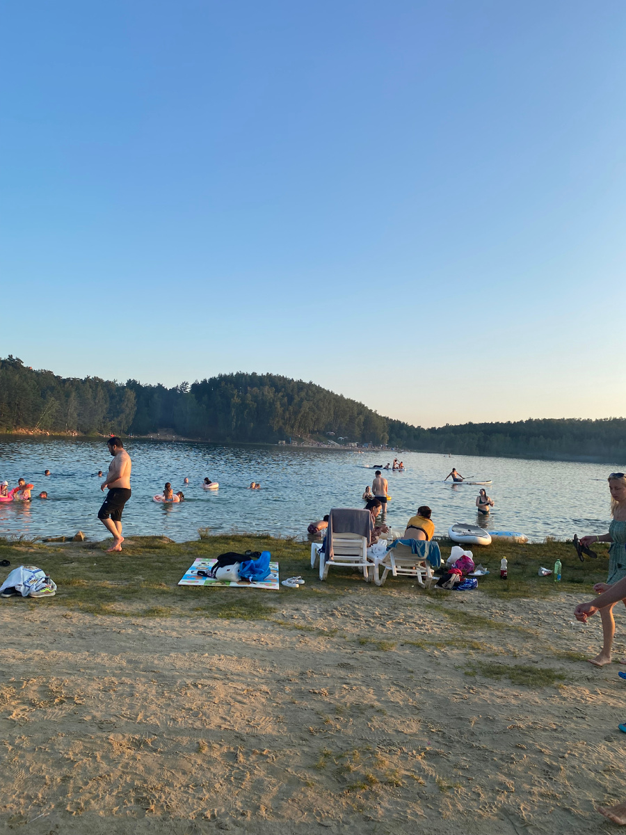 Сегодня мы втроем( я , супруг и Олеся) снова ездили на карьер в Лыткарино. Как говорится, хватаем купальный сезон за хвост. Надо ловить хорошие деньки, пока дожди прекратились, а вода теплая. А она действительно теплая! Смотрите , сколько людей одновременно плещутся в воде. И это уже в 20ч вечера. Основная масса людей уже домой ушла. А пляж по- прежнему заполнен отдыхающими. Мы появились здесь сегодня поздновато, только в 17 часов. А народу- то! Я не шучу, мы реально на огромном пляже еле нашли местечко, чтобы разместиться на своих покрывалах. Еле втиснулись среди людей. Помните, как это бывало, например , в Сочи? Вот так выглядел пляж примерно в 19.30. Машины уезжали со стоянок нескончаемым потоком, их было очень много. Въезд, кстати, на территорию пляжа 500 руб. Плату впервые в этом году стали брать, я , думаю, что скоро увеличат стоимость парковки . А что бы нет?😬 Вода сегодня очень приятная была! Правда , пока заходишь в воду( а мы делаем это медленно🤭) , тебя все заплещут,