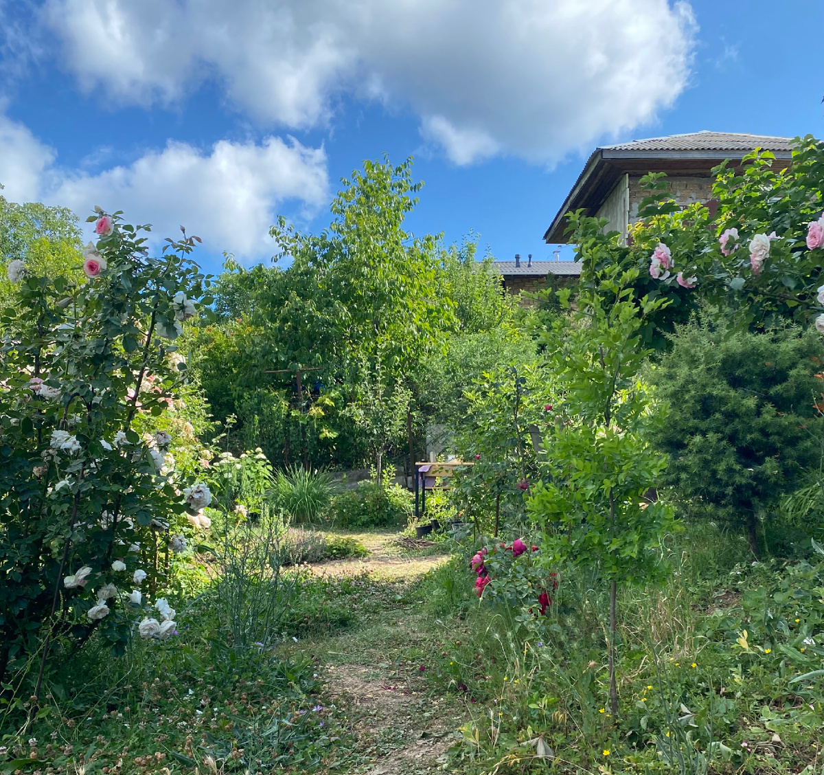 01.08.25 Все относительно. То, что для соседа север, для меня юг.)) Те, кто, на старых дачных участках (4,5,6 соток) определенных ещё в 90-е, выдерживал расстояния в посадках от заборов, от построек, мне неизвестны. В нашем Товариществе таких нет. Картина: сосед насажал кустов «в забор», а затем забор начал расти в твою сторону. Реакция: хорошо, что не деревья. Затем я поняла, что при нашем заборе из сетки-рабицы, соседская зелень это хорошо. Регулярная стрижка со своей стороны и зелёные ширмы на соседском участке создают необходимую глубину. На представленном фото просматривается два соседних дачных дома и, почти полностью,)) насквозь наш участок. Хорошо видно, что в нашем саду тропинки протоптаны, не заросшая пустошь, но работать есть над чем. Подрастают потихоньку и наши деревья и кусты, и соседские. Высаживая растения, особенно деревья и кусты, особенно на маленьком участке (у нас 5 соток) следует постараться представить себе их во взрослом состоянии. Хочется и персик и абрикос
