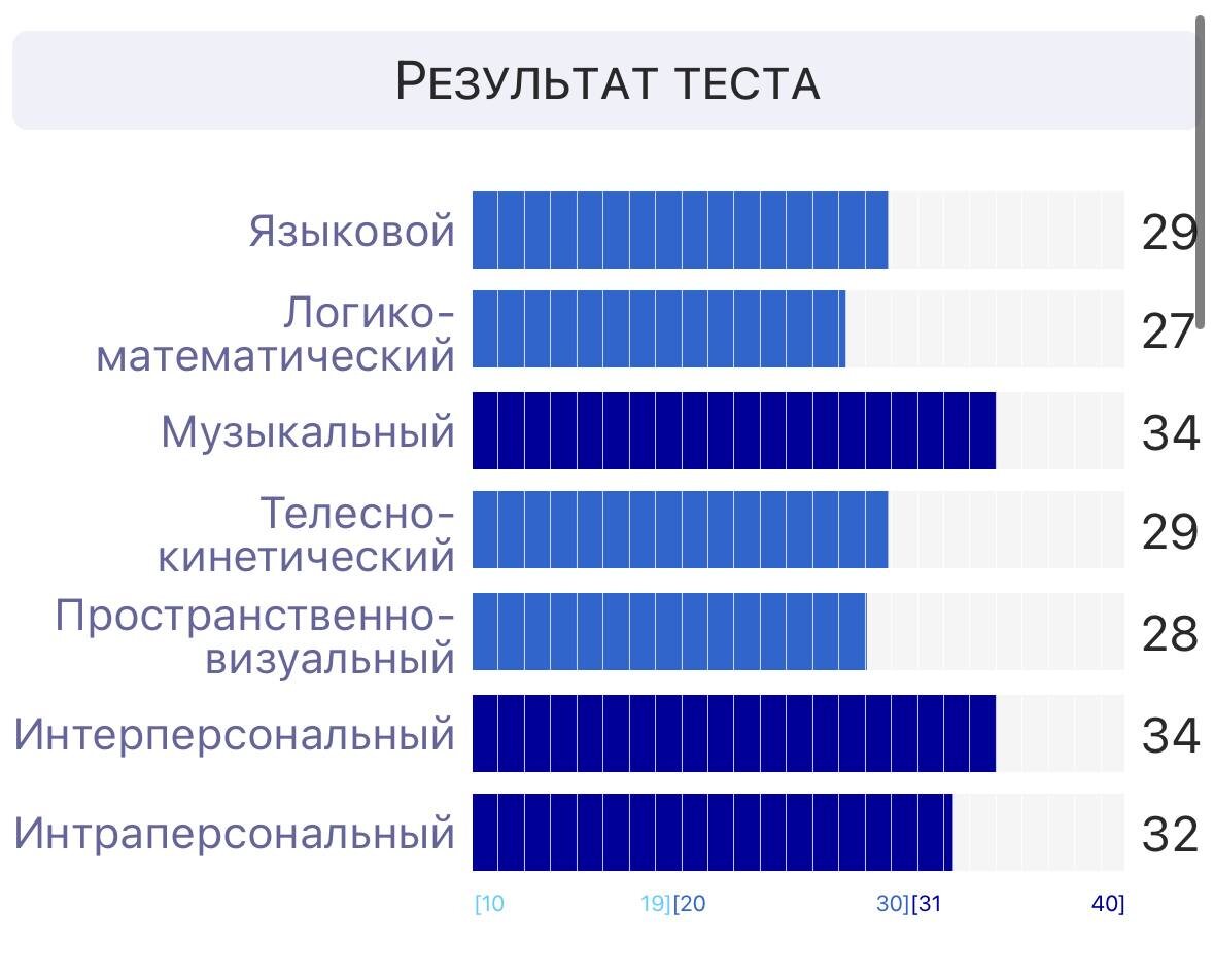 Неожиданно: у меня превалирует музыкальный интеллект Прошла тест множественного интеллекта Гарднера (ссылка): у меня 3 вида интеллекта в высоком диапазоне (музыкальный, интерперсональный, интраперсональный), остальные - выше среднего (языковой, телесно-кинетический, пространственный и логико-математический). Во-первых, я искренне думала, что все просыпаются с музыкой в голове, которая задаёт их день, или переводят эмоции или застрявшие мысли в песни. Оказалось - это мои приколы. Во-вторых, так как мне нравится и в себя с головой уйти, и других поизучать с пристрастием, расспросить всё до нулевого слоя - я не понимала, зачем многих заносит в крайности: либо кайфуют одни, либо в обществе. Если можно взять все. Оказалось не можно: интерперсональный (межличностный) и интраперсональный (внутриличностный) типы интеллекта почти никогда не могут быть развиты в равной степени, обычно один из них развит больше. Ну то есть ты либо интроверт, либо экстраверт. Я получилось что амбиоверт. Таких
