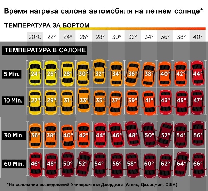 Даже при +25°C на улице, внутри машины под прямыми солнечными лучами уже через 10 минут +34°C, через 30 минут до +48°C!