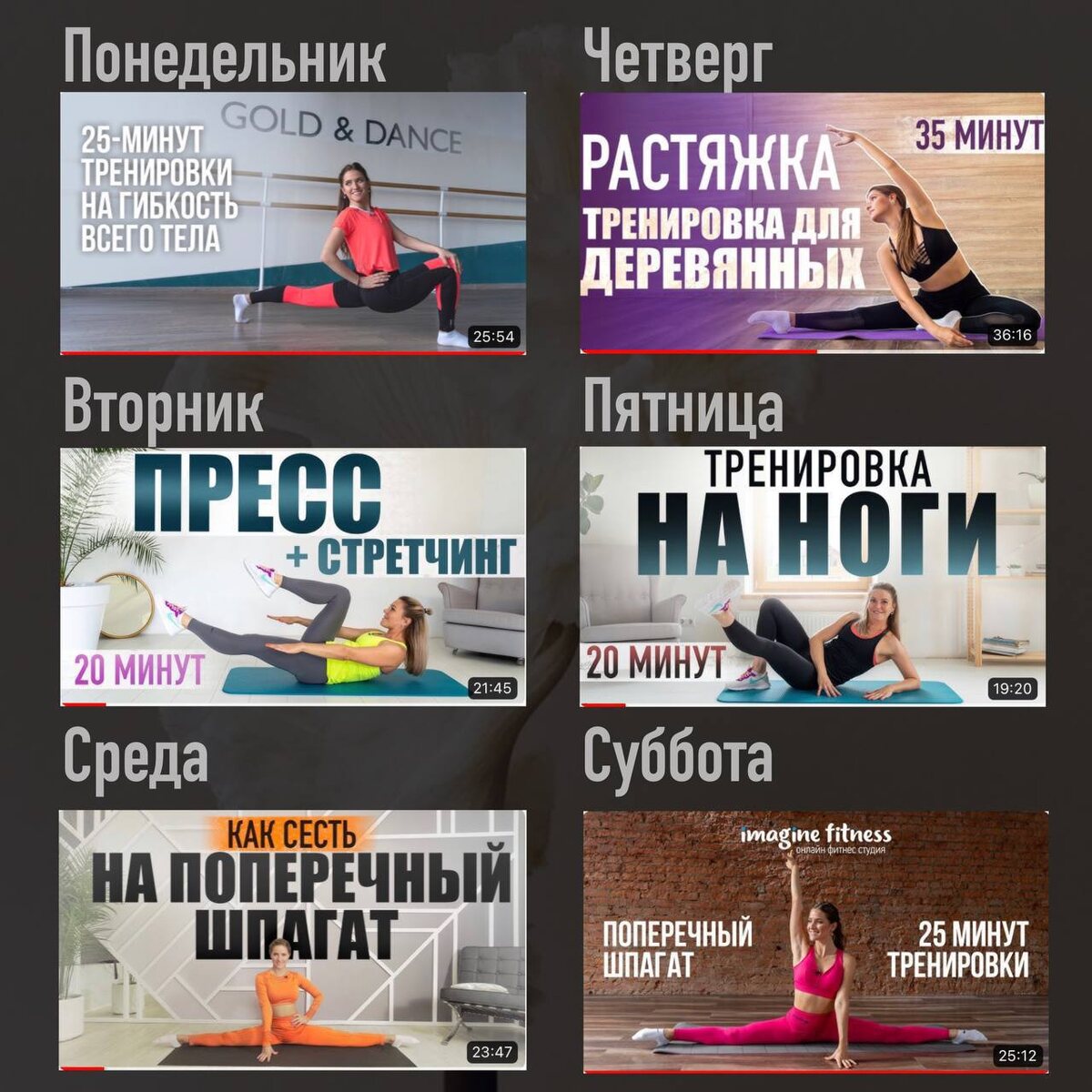 Всем привет! 🤸♀️ Мы, как и всегда, подготовили для вас новый #плантренировок_if на эту неделю. В этот раз мы сделаем особый акцент на поперечный шпагат с плавной подготовкой и растяжкой всего тела! Сохраняйте себе этот пост, подписывайтесь и следите за обновлениями на нашем канале. Каждый день мы публикуем активную ссылку на тренировку — остаётся только нажать на неё и начать заниматься. Ставьте 🔥, чтобы не пропустить! ◻️◻️◻️◻️ Запишись на онлайн-курсы от Imagine fitness: Онлайн-курс «Вечерняя йога» от Юлии Пегасовой Онлайн-курс «Утренняя йога» от Юлии Пегасовой Онлайн-курс «Утренние зарядки» от Котельниковой Дарьи Большой онлайн курс по шпагату от Котельниковой Дарьи. Длительность: 30 дней Онлайн-курс для похудения от Натальи Пироговой: Длительность: 30 дней Открой доступ к курсу уже сегодня!