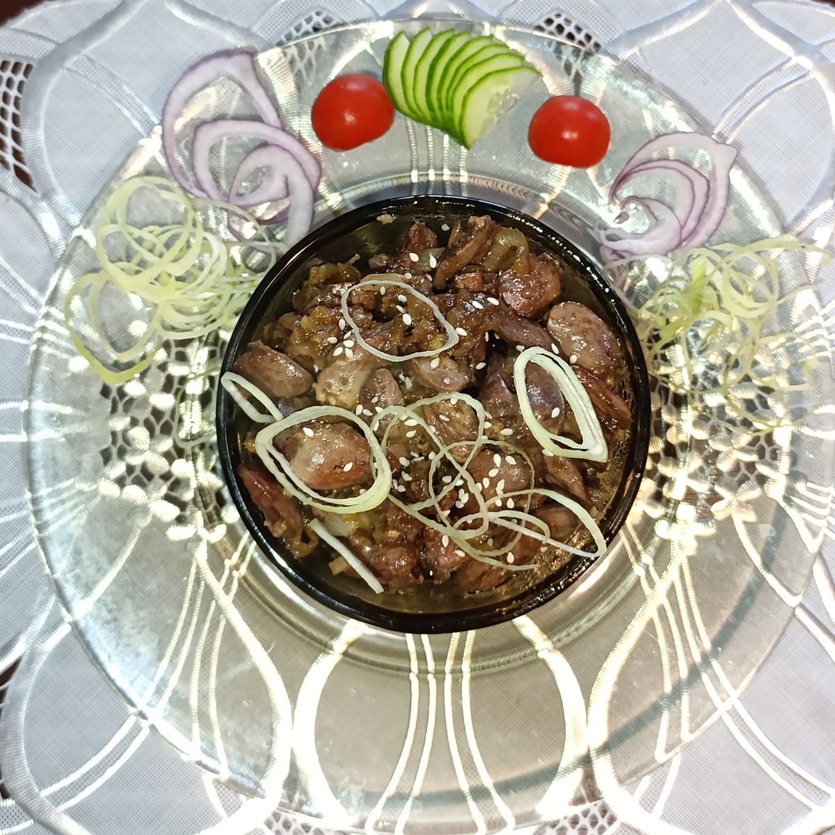 Ингредиенты: куриные сердечки 800 гр лук 1 шт чеснок 6-8 зубчиков сахар 2 ст л соевый соус 150 мл перец молотый по вкусу (0,25 ч л - стандартно) кунжут для посыпания зеленый лук для украшения Лук очистить, нарезать полукольцами и обжарить. Если луковица большая, то нарезать четвертинками колец. Смешать соевый соус, сахар, перец и измельченный чеснок. Отставить в сторону, чтобы немного настоялся, пока мы будем готовить остальное. В обжаренный лук добавить сердечки. Перед этим их нужно разрезать пополам вдоль, обмыть, обсушить. Можно помельче порезать при желании. Обжариваем (около 5-7 минут). В обжаренные сердечки с луком добавляем наш соус. Накрываем крышкой и тушим 10-15 минут. Наши сердечки в чесночном соусе готовы. Посыпаем кунжутом и мелконарезанным зеленым луком. Я использовала для верхнего украшения колечки лука-порея. С ним тоже вкусно, но с зеленым луком - нежнее. Приятного аппетита!!!!