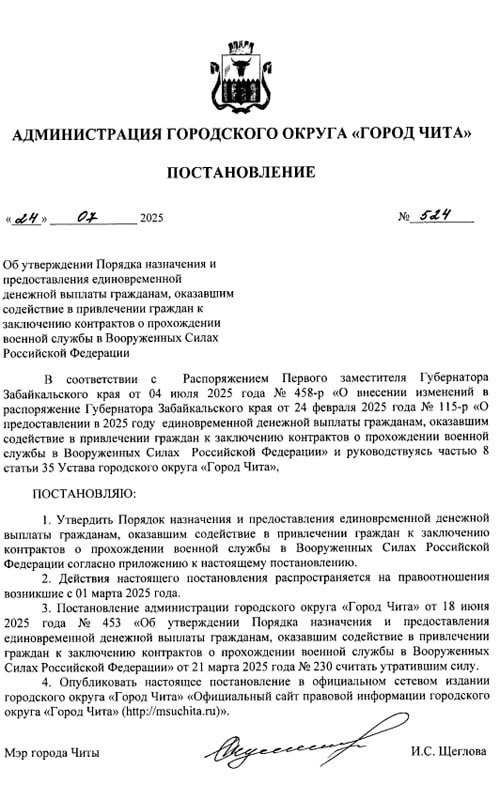 Мэрия Читы будет платить людям за поиск желающих подписать контракт с Минобороны Мэр Читы Инна Щеглова подписала постановление о «порядка назначения и предоставления единоровременной денежной выплаты гражданам, оказавшим содействие в привлечении граждан к заключению контрактов о прохождении военной службы». Документ опубликован на сайте администрации. Решение принято в соответствии с «распоряжением» первого вице-губернатотра Забайкальского края от 4 июля. Чтобы получить деньги, людям нужно написать заявление, подписать согласие на обработку персональных данных, предоставить копию паспорта и реквизиты счёта. Сумма выплаты в документе не указана. Что именно подразумевается под «содействием в привлечении» контрактников, также не уточняется. Неизвестно, подпадут ли под эту норму, например, предложения со стороны силовиков заключать контракты с Минобороны на стадии следствия по уголовным делам, Аналогичные постановления опубликованы на сайтах мэрии Краснокаменска, администрации Улёт