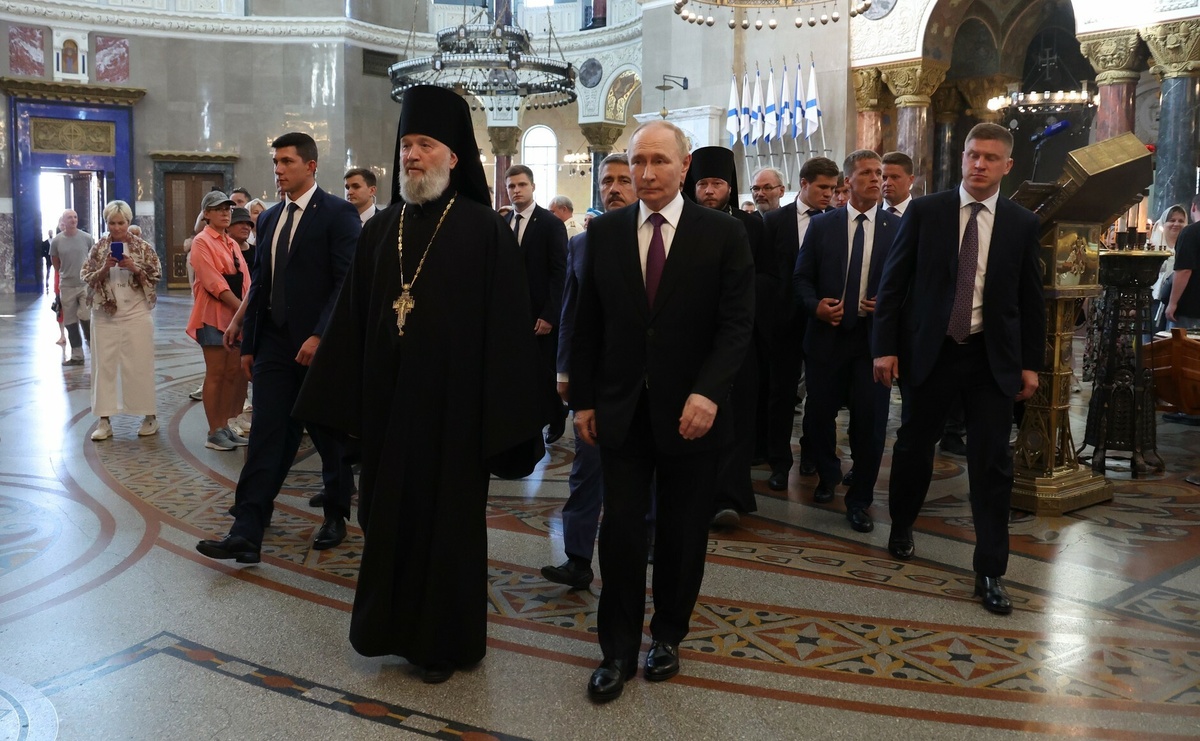 Вчера, 27 июля, рамках поездки в Северо-Западный федеральный округ Президент посетил Морской собор святителя Николая Чудотворца и поднялся на борт фрегата «Адмирал Григорович» в Кронштадте. В Никольском ставропигиальном Морском соборе главу государства встретил настоятель архимандрит Алексий (Ганьжин), который провёл для него краткую экскурсию. Владимир Путин приложился к иконе и мощам святителя Николая Чудотворца и поставил свечи за упокой. Верховный Главнокомандующий также посетил фрегат «Адмирал Григорович», состоящий на вооружении Черноморского флота. Президент поблагодарил экипаж за службу, оставил запись в книге почётных гостей и присвоил командиру корабля звание капитана 2-го ранга.